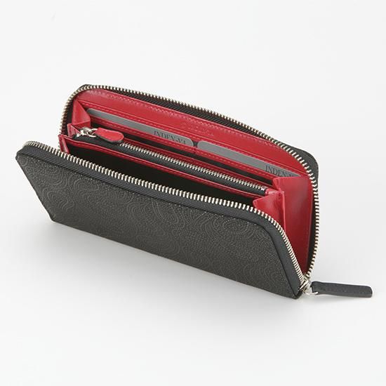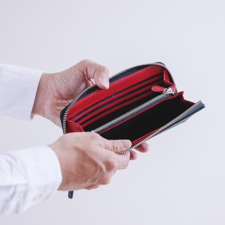 ラウンド型でスムーズに開閉できるファスナーを開くと、赤い裏地がそっと覗きます。カードポケットも多く、収納力抜群。