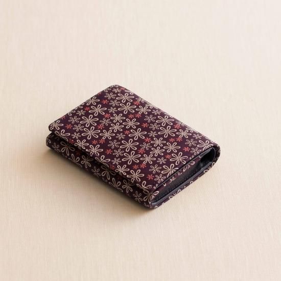印傳屋の「ねいろ」シリーズは、紫の鹿革に可憐な「雪割草」を赤と白の二色の漆で描いています。