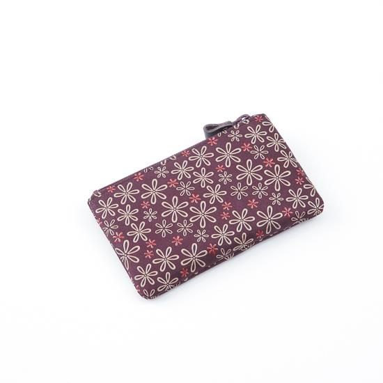 印傳屋の「ねいろ」シリーズは、紫の鹿革に可憐な「雪割草」を赤と白の二色の漆で描いています。