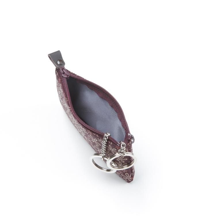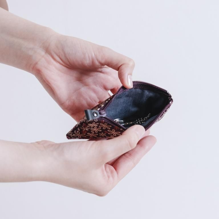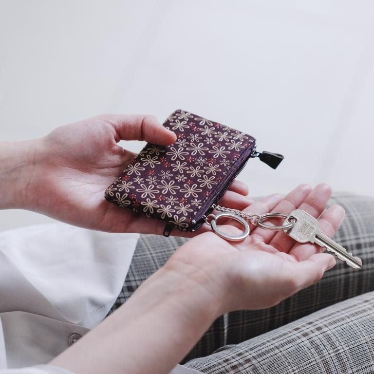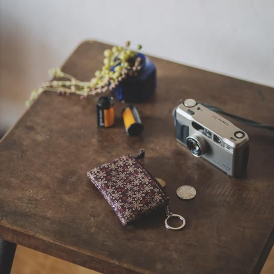 2つのキーリングを備えるキーケースです。ファスナーのジップ部分を革で包み模様の可憐さを引き立てました。