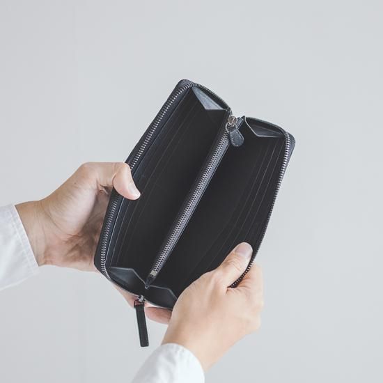 印傳屋で最も大きいサイズのファスナー式長財布です。お札、小銭、カード、レシートなどを全て入れた状態でも、スマートな印象は変わりません。
