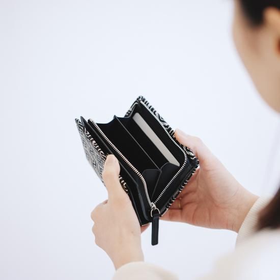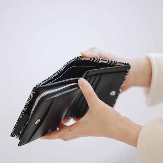 二つ折りのお財布を、従来の機能はそのままに手のひらサイズまでコンパクト化しました。札入は、中仕切りで2つに分かれ整理しやすい仕様。ホックで開く内側と小銭入の中に複数のカードが収納できます。本シリーズ共通の丈夫なファスナーがL字に大きく開くため取り出しやすさも容量も抜群。