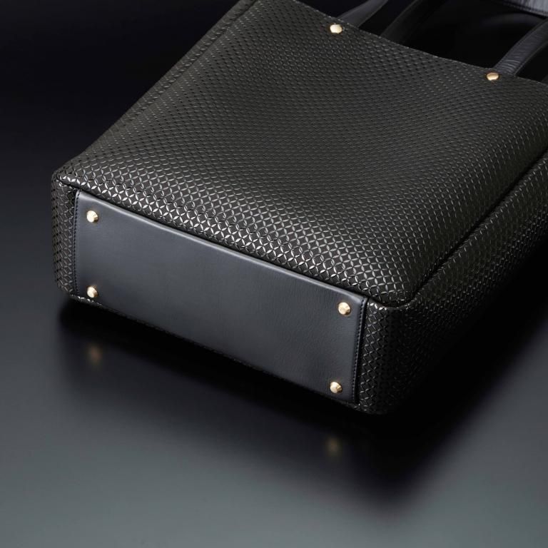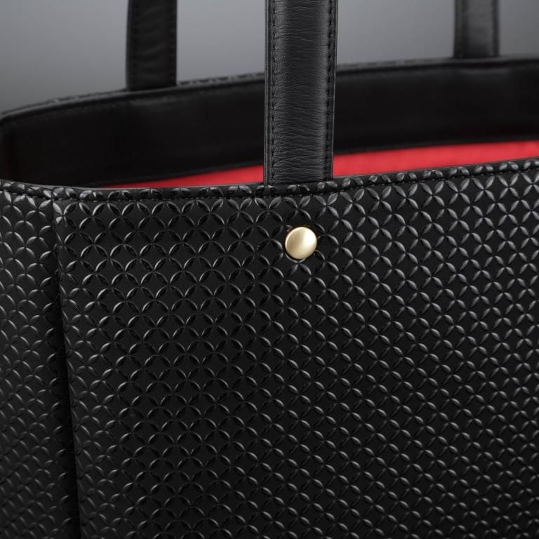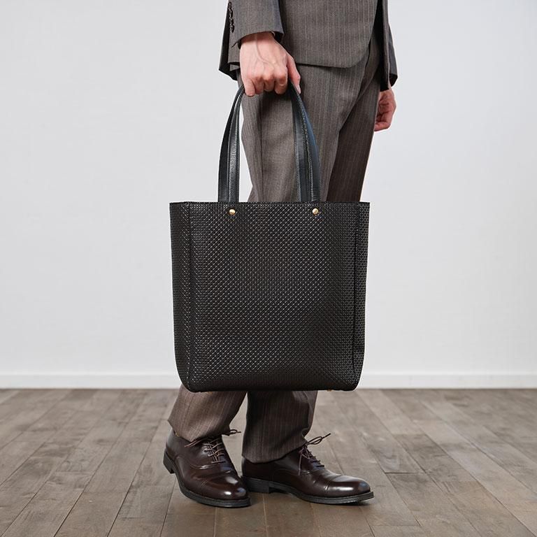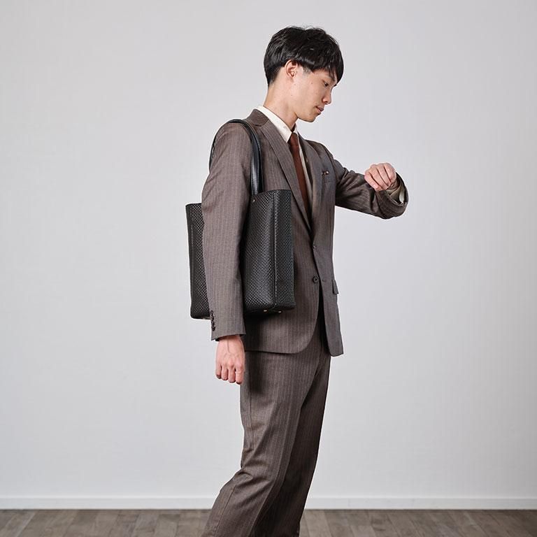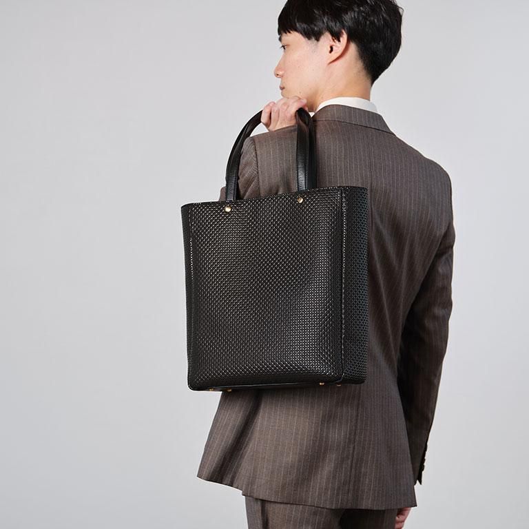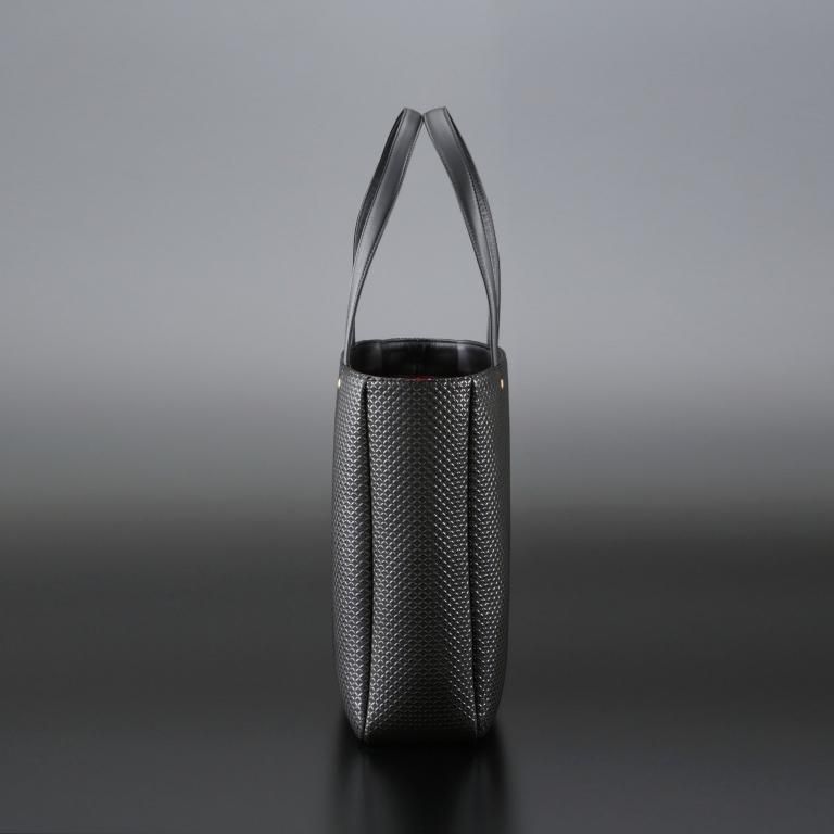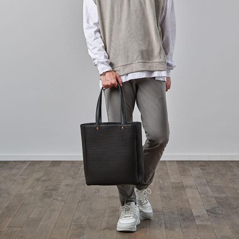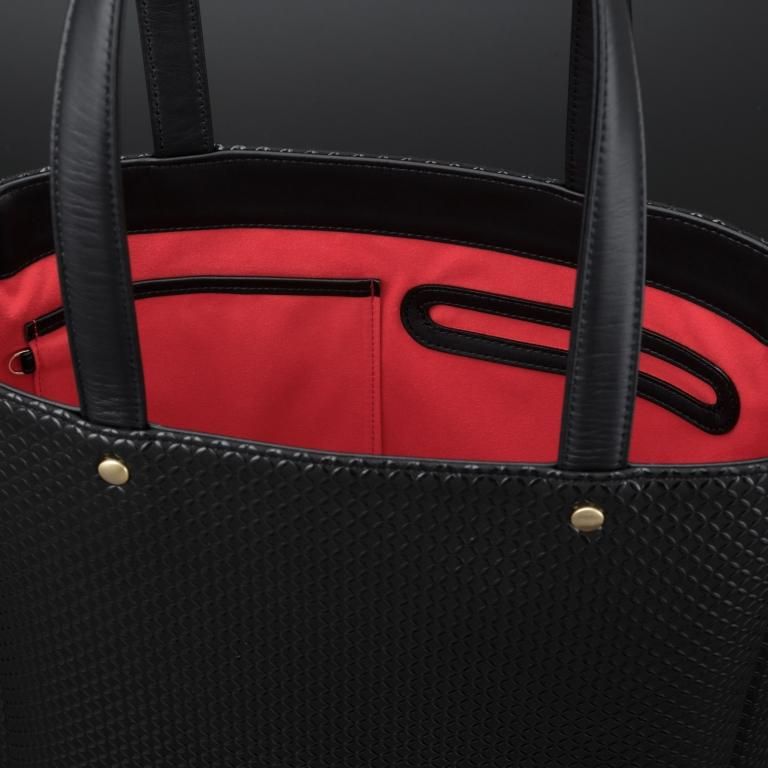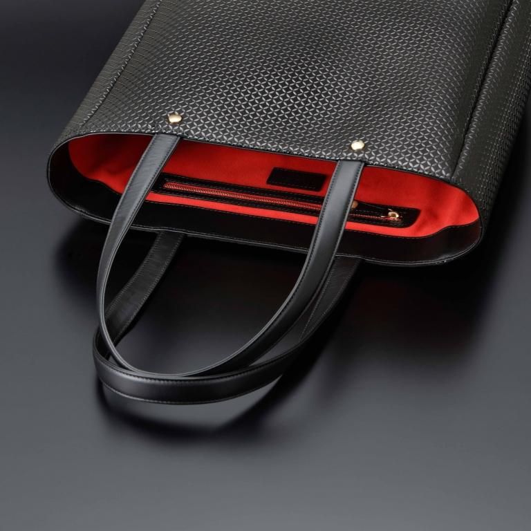 カジュアルなシーンでも使いやすい丸みを帯びた形状のトートバッグ。肩がけしやすいハンドルの長さや便利な内ポケット、アクセントカラーのレッドが映える裏地など、機能性に遊び心を加えています。