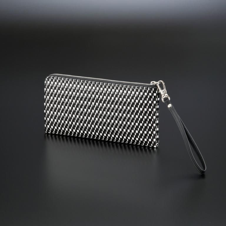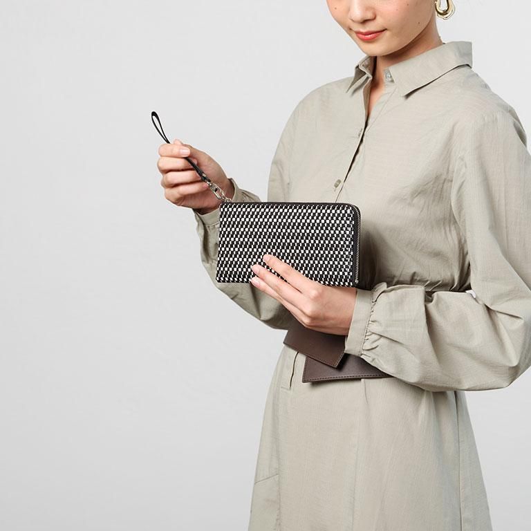 モノトーンデザインがスタイリッシュな印象を醸すハンドストラップ付きのファスナー長財布。