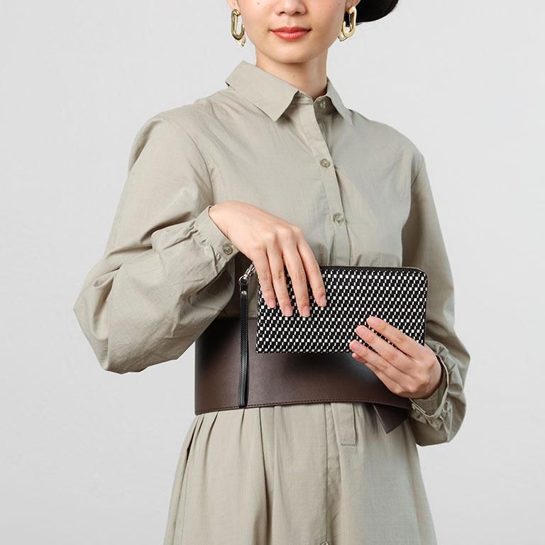 女性らしいディテールに、大きく開いて出し入れしやすいL字ファスナーを採用。