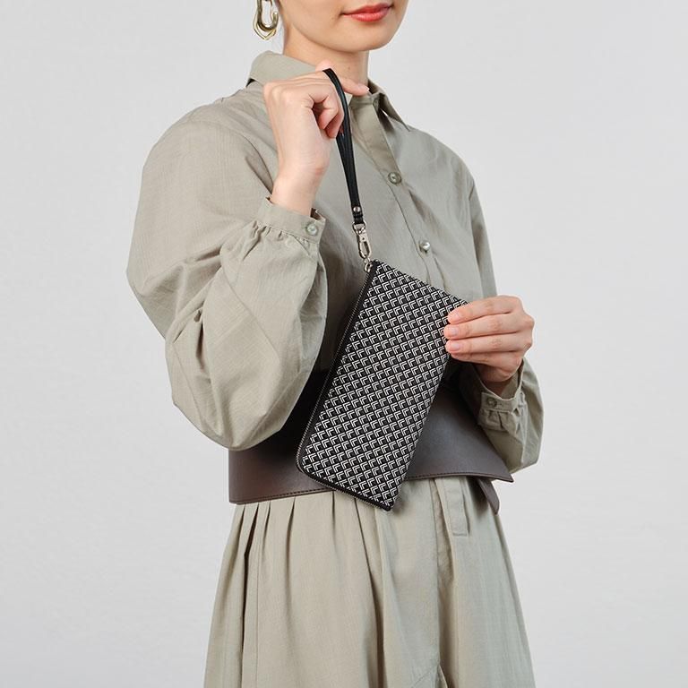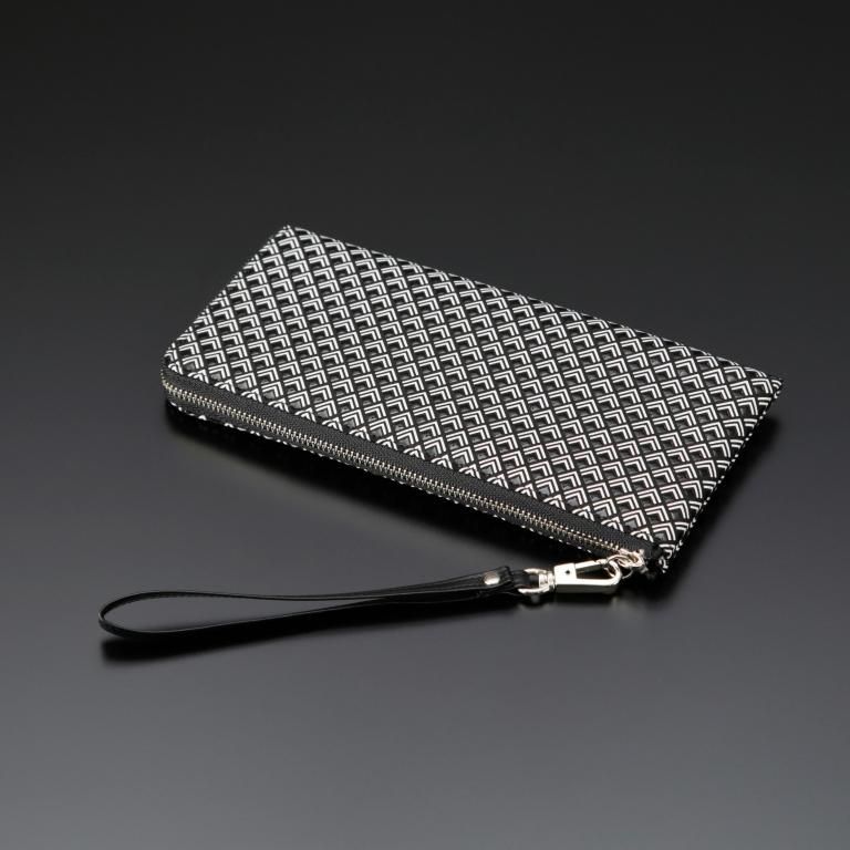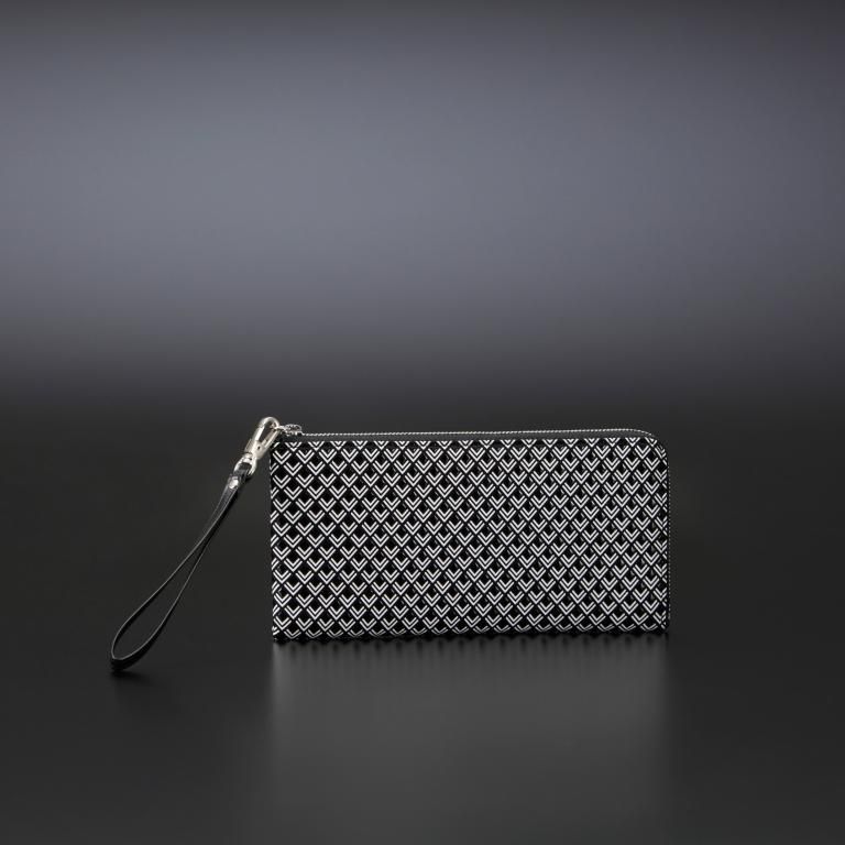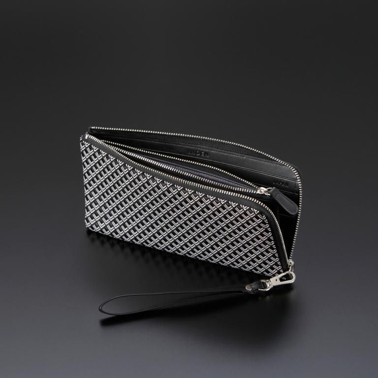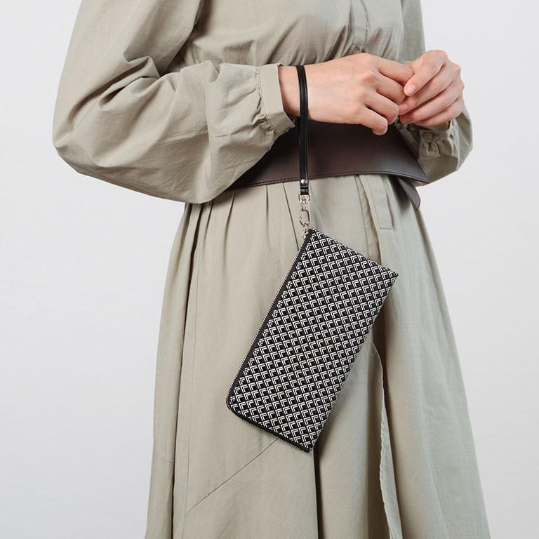 モノトーンデザインがスタイリッシュな印象を醸すハンドストラップ付きのファスナー長財布。
