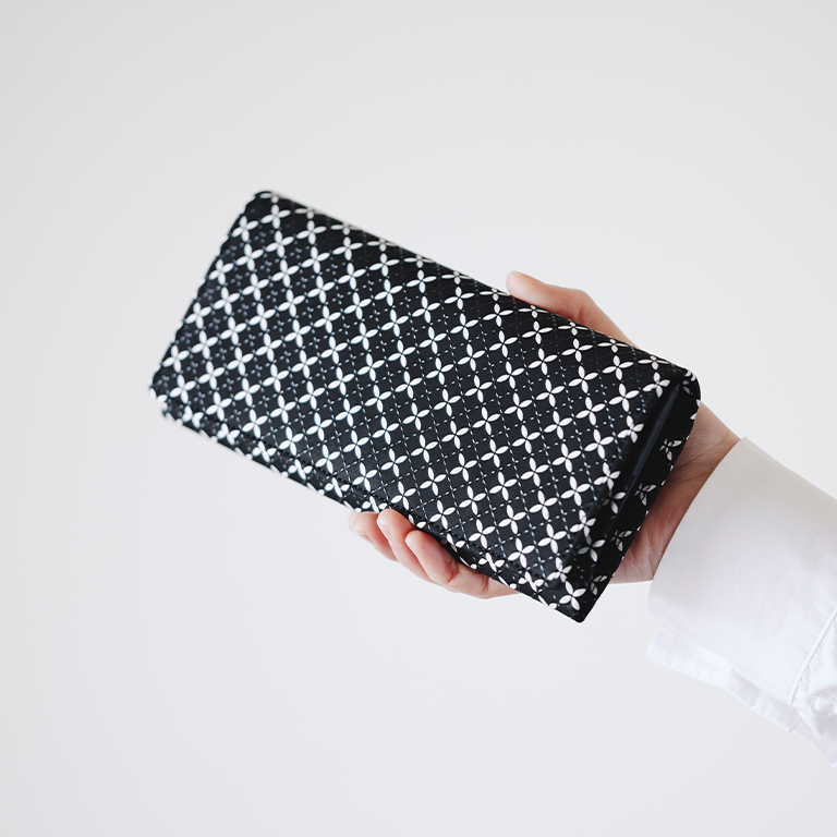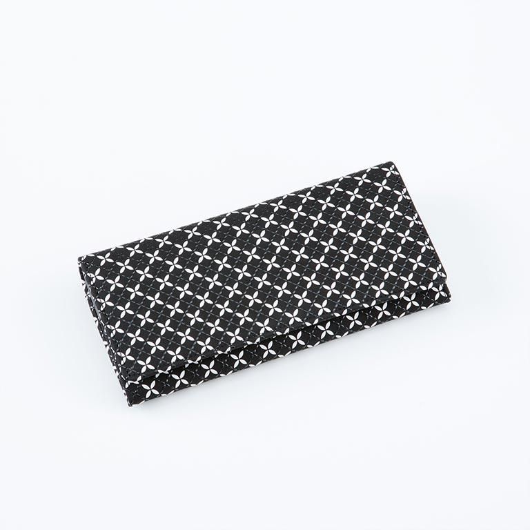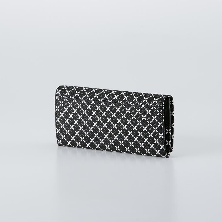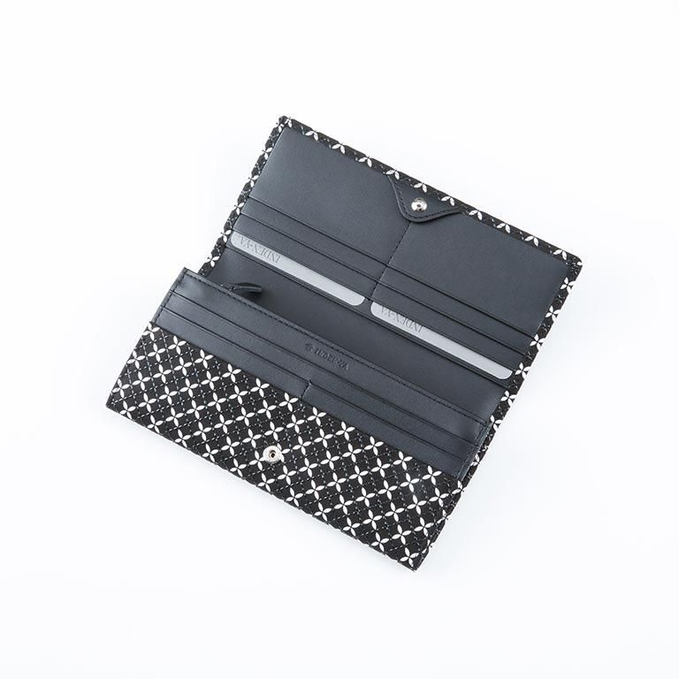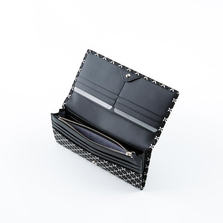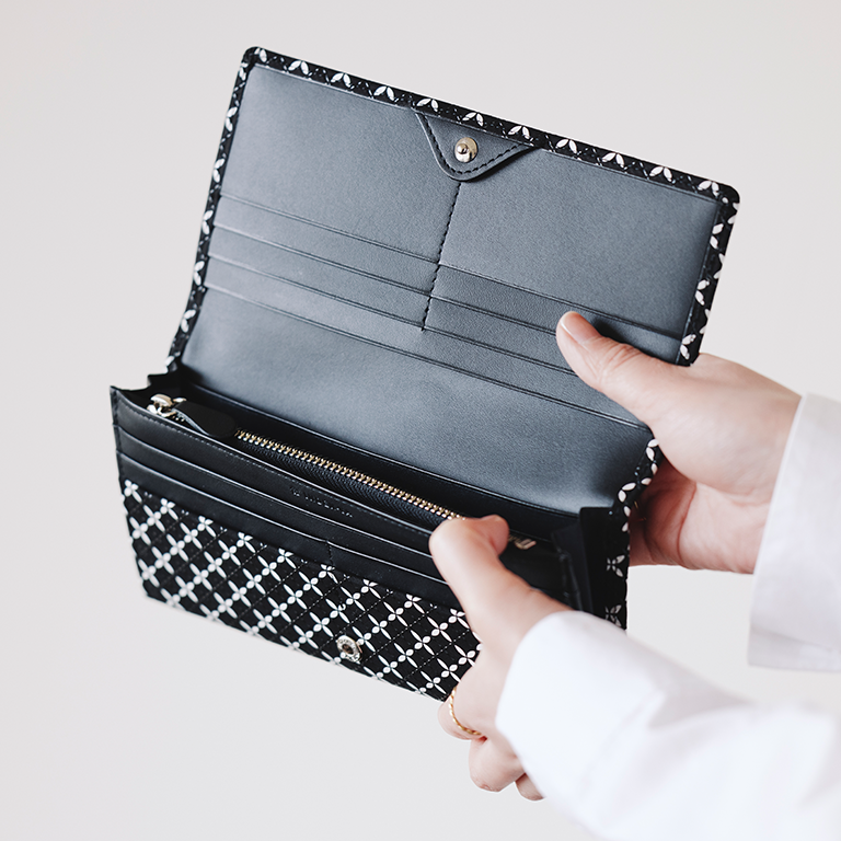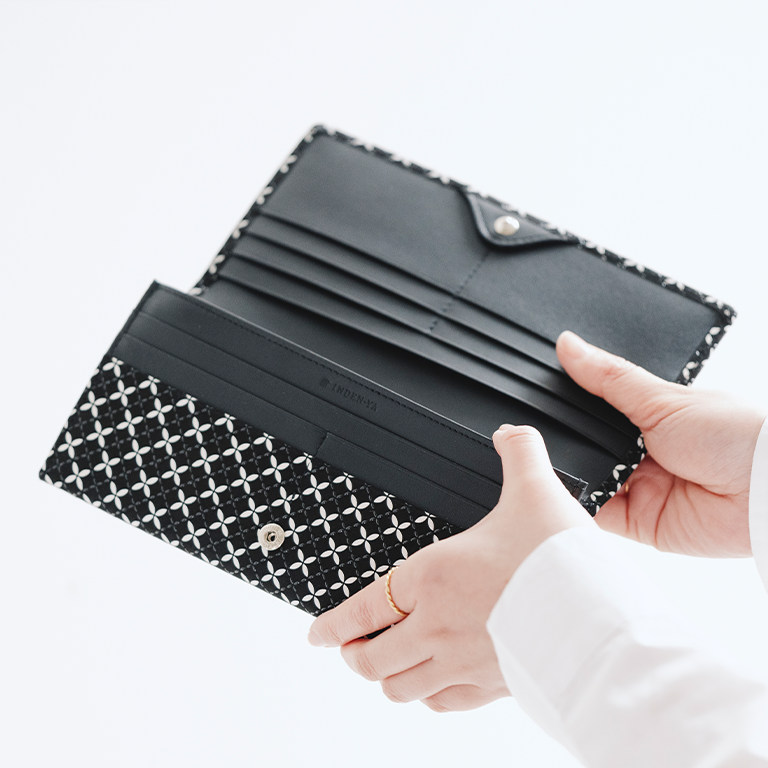印伝革ならではの手触りと、艶やかな漆模様を贅沢に愉しめるようにデザインしたレディースの長財布。
