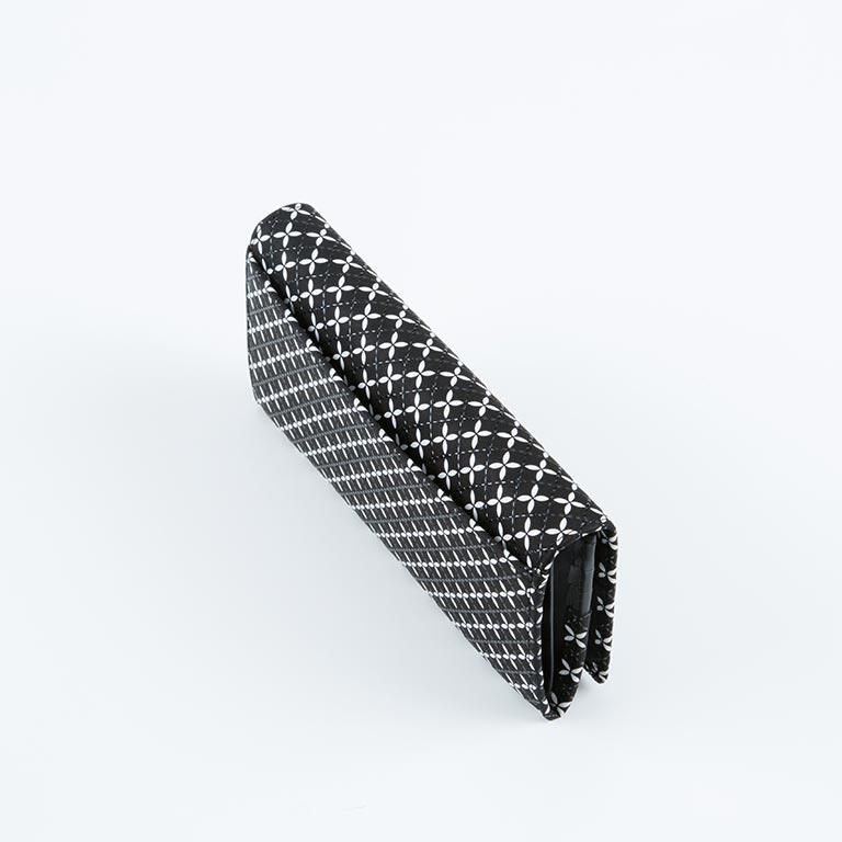 幸せや縁が広がる模様として親しまれる七宝をつなげて、白更紗と黒漆のコントラストで描き、