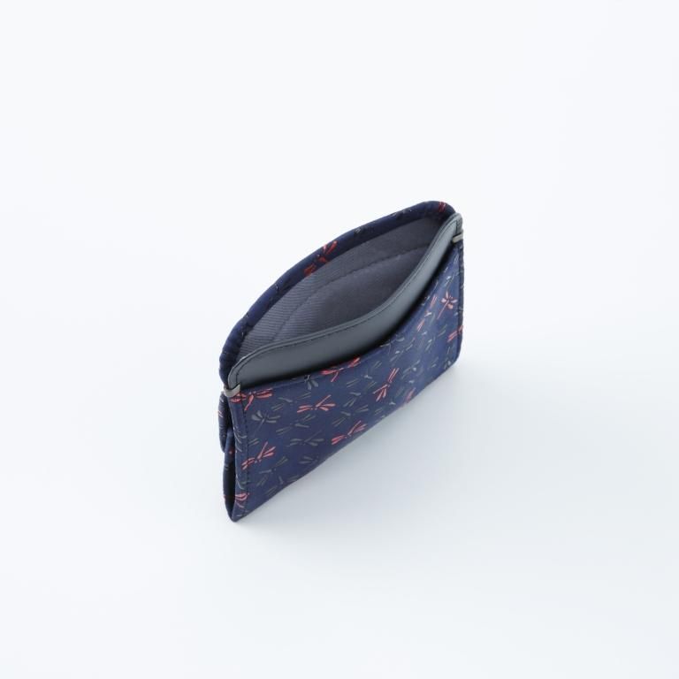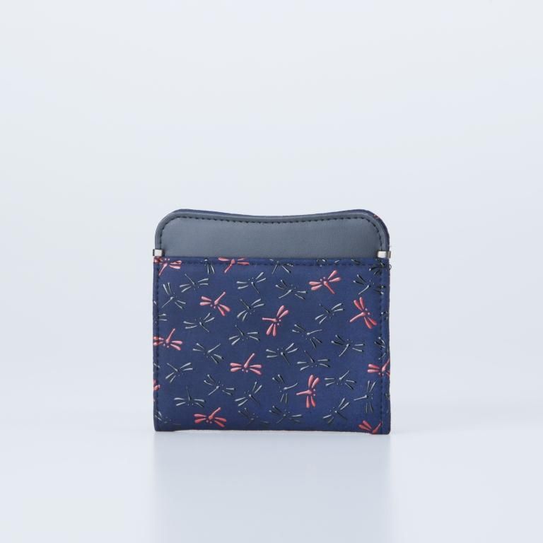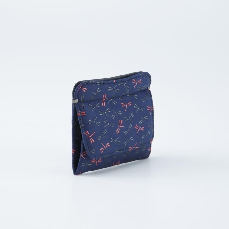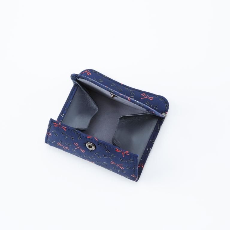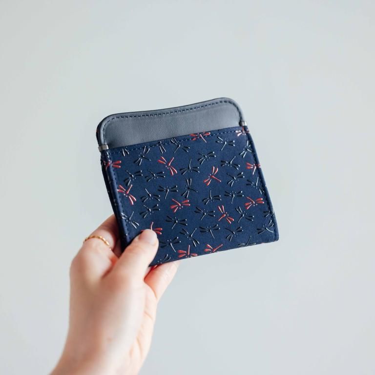落ち着いた紺革の風合いに、赤漆で描いた赤とんぼがアクセント。