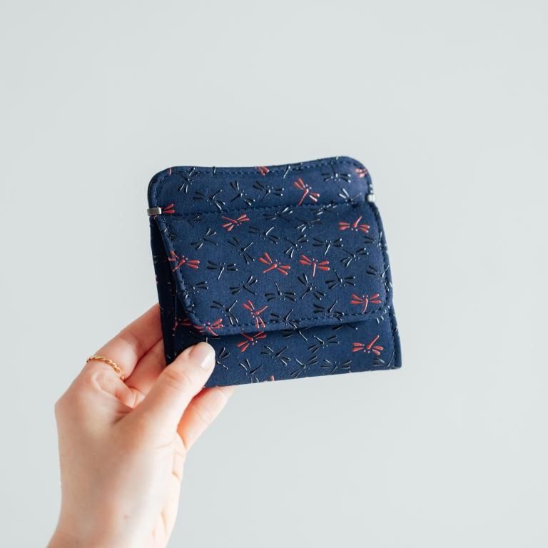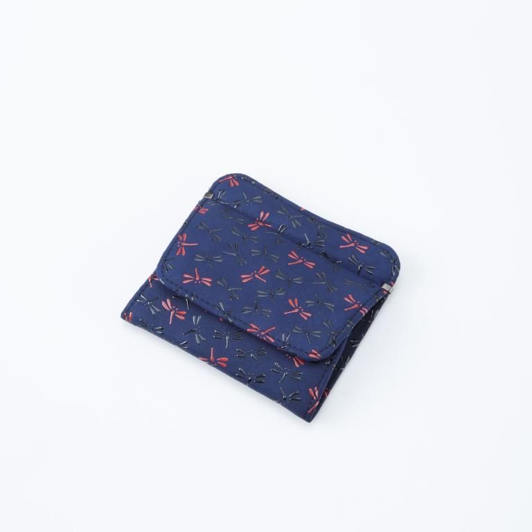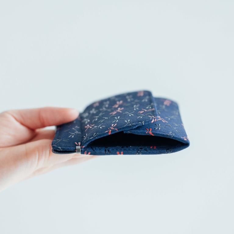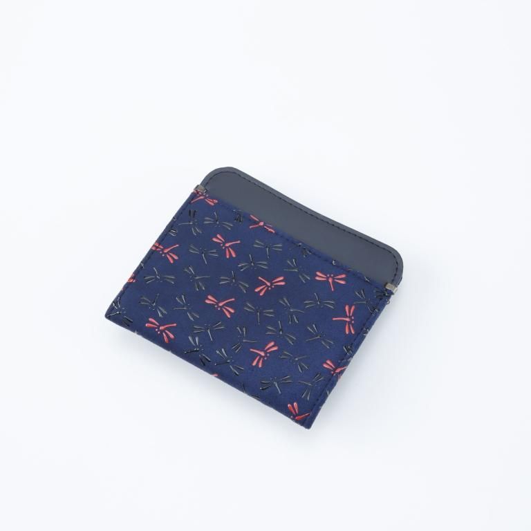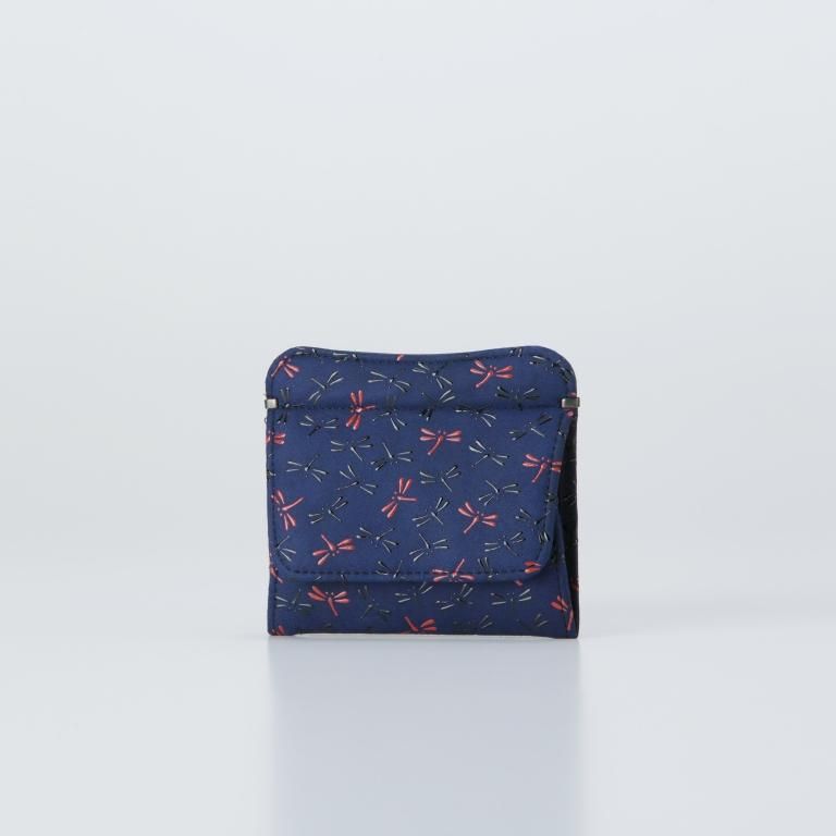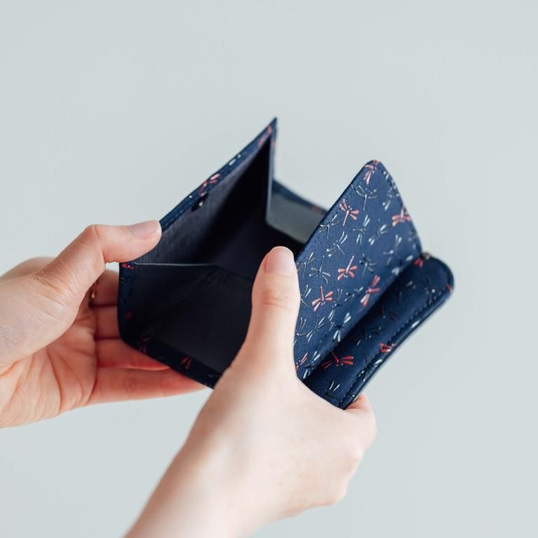 落ち着いた紺革の風合いに、赤漆で描いた赤とんぼがアクセント。