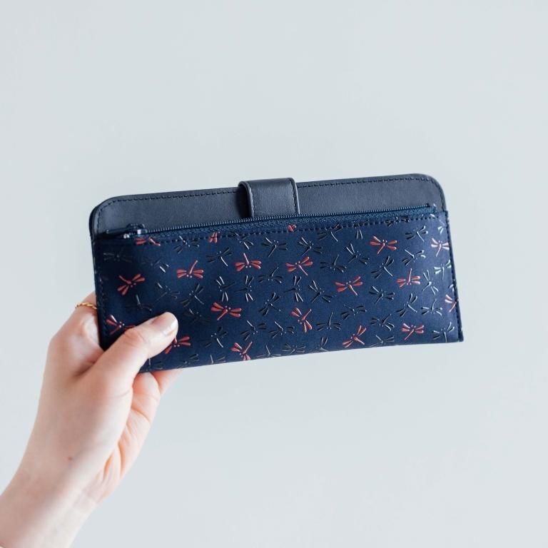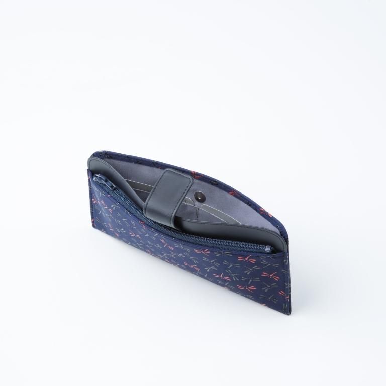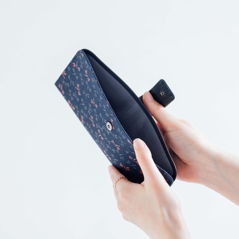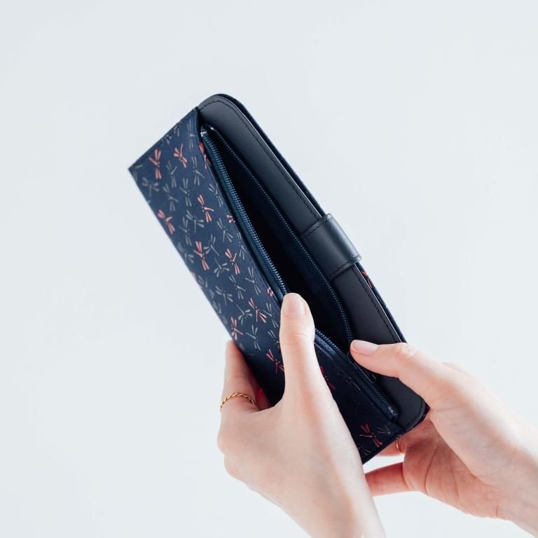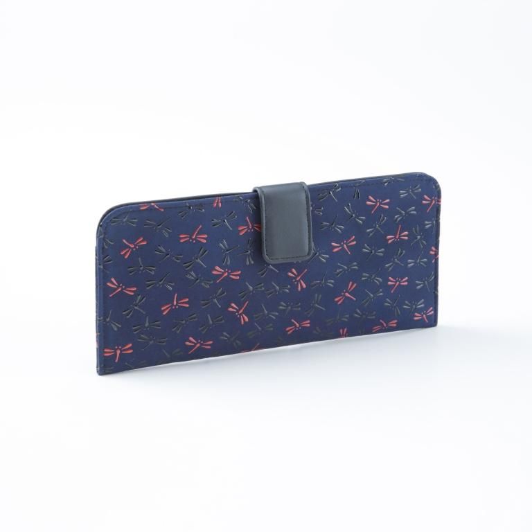 落ち着いた紺革の風合いに、赤漆で描いた赤とんぼがアクセント。