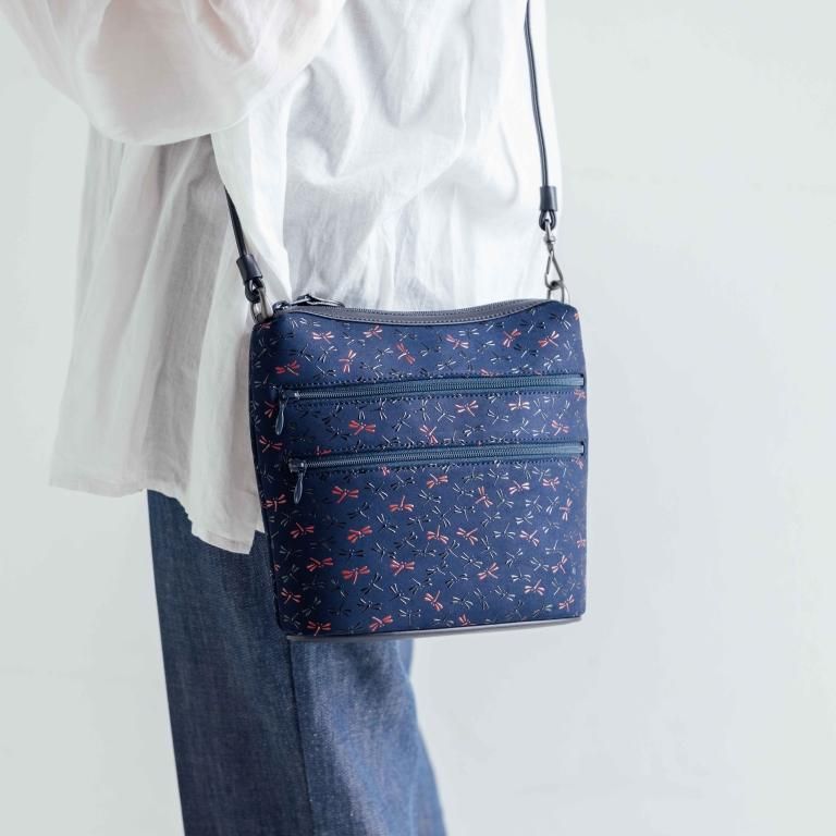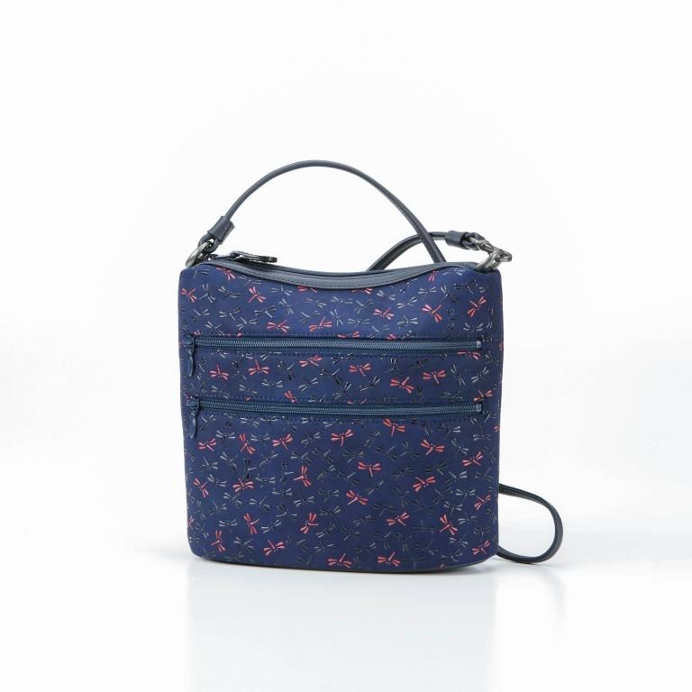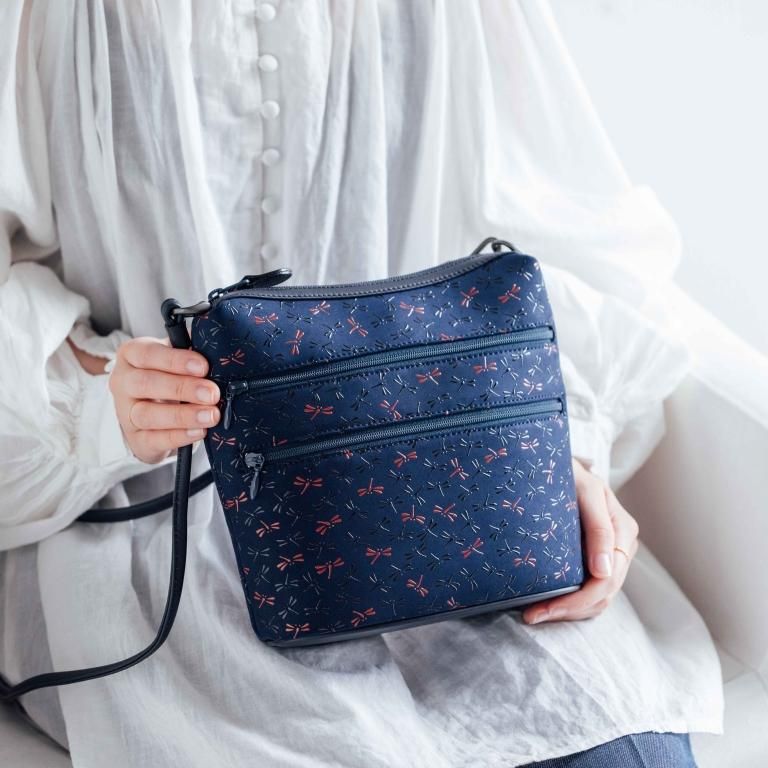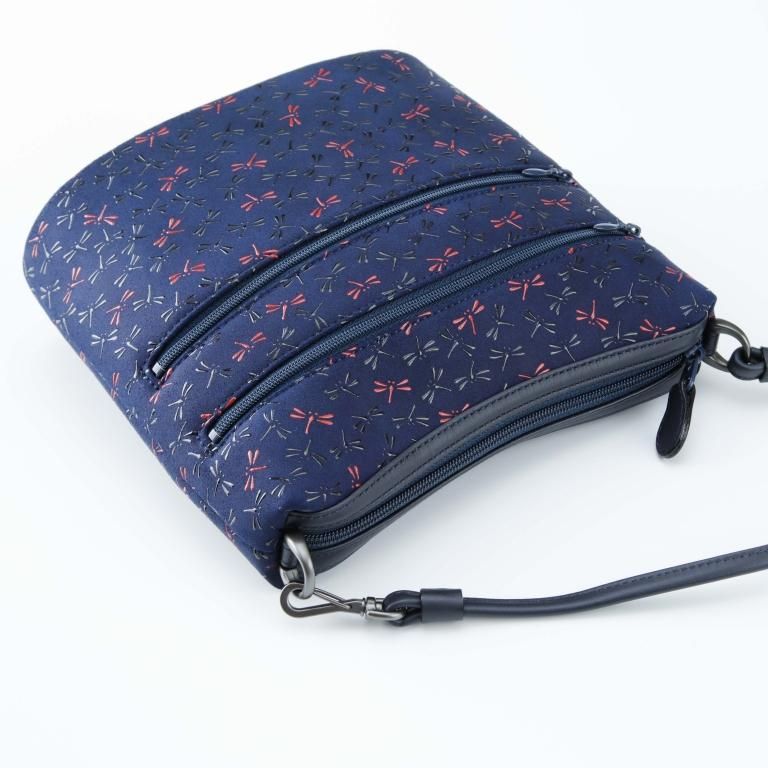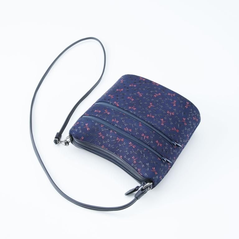 落ち着いた紺革の風合いに、赤漆で描いた赤とんぼがアクセント。