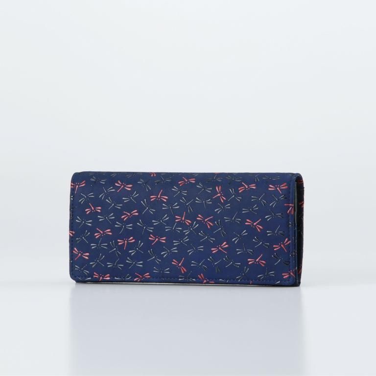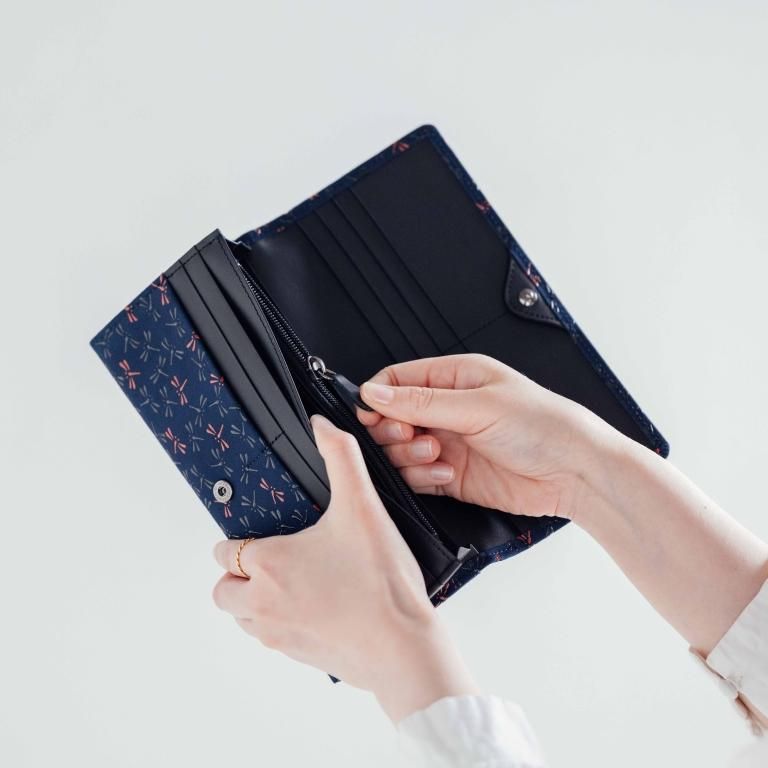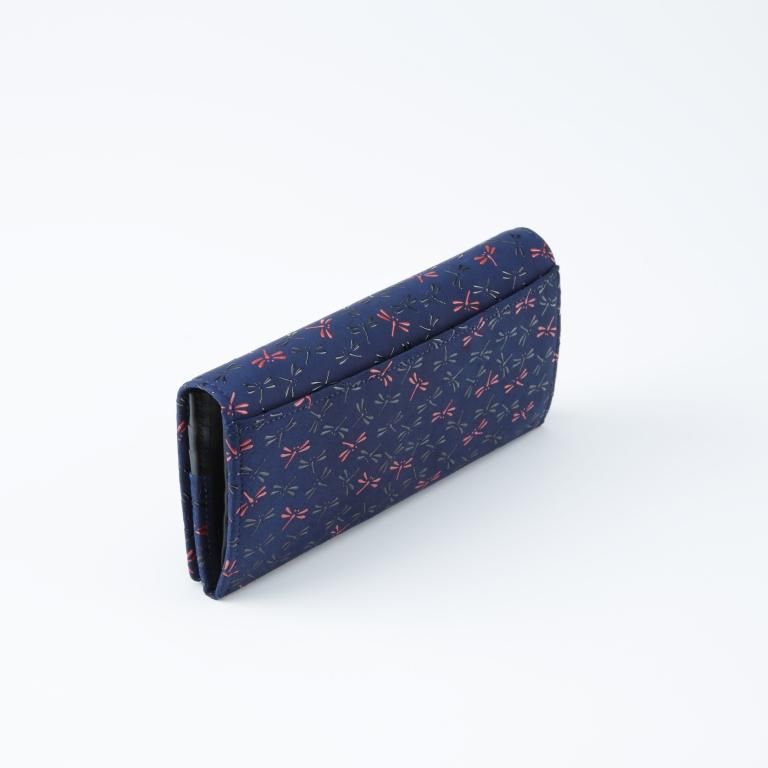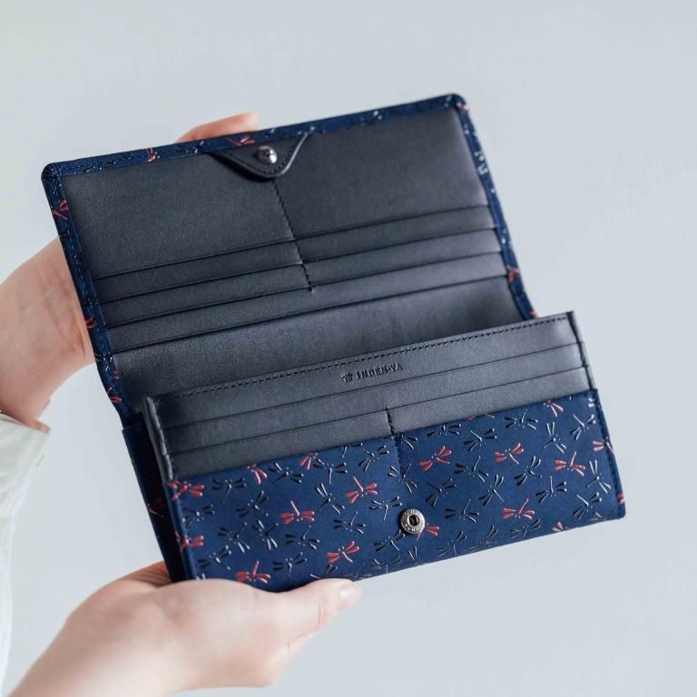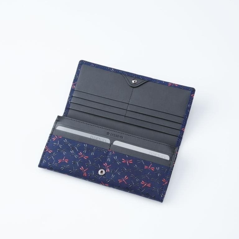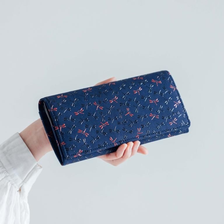 落ち着いた紺革の風合いに、赤漆で描いた赤とんぼがアクセント。