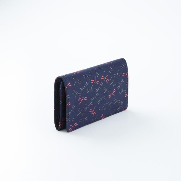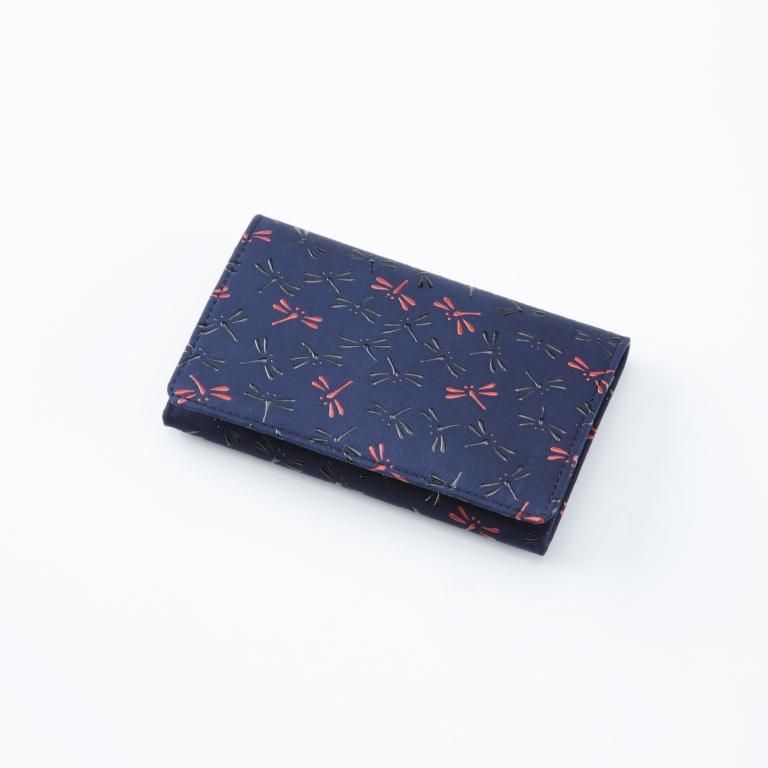 落ち着いた紺革の風合いに、赤漆で描いた赤とんぼがアクセント。