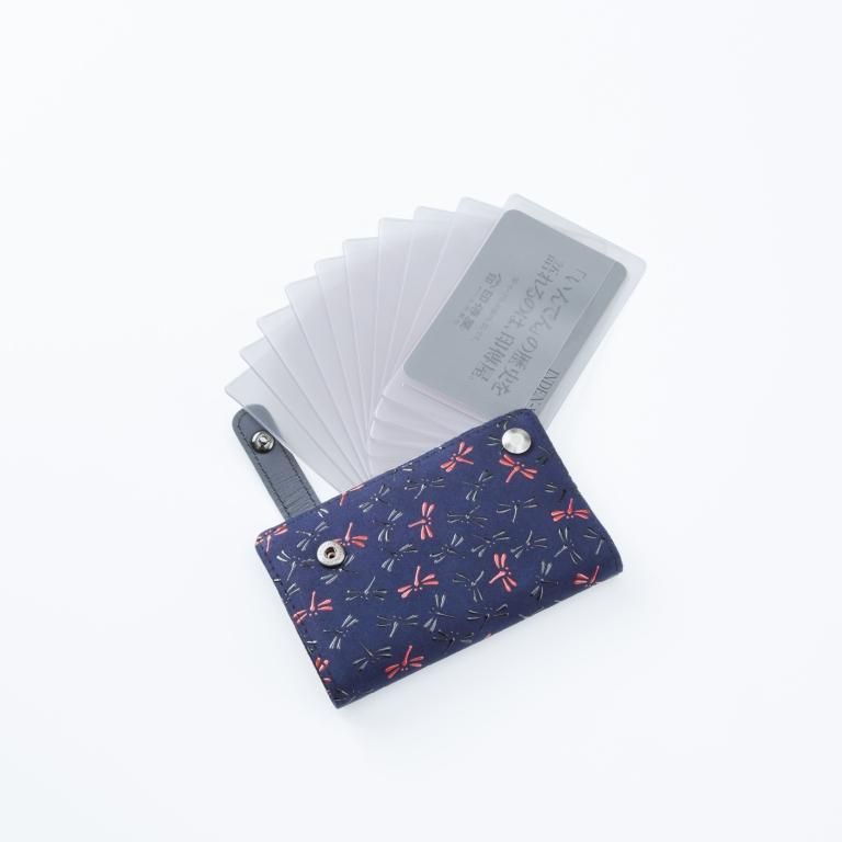 落ち着いた紺革の風合いに、赤漆で描いた赤とんぼがアクセント。