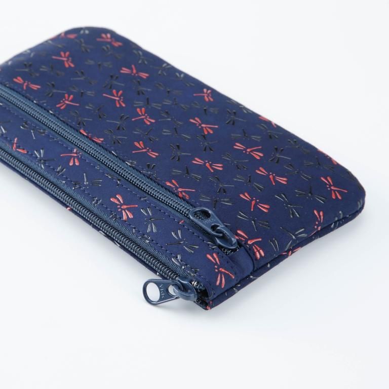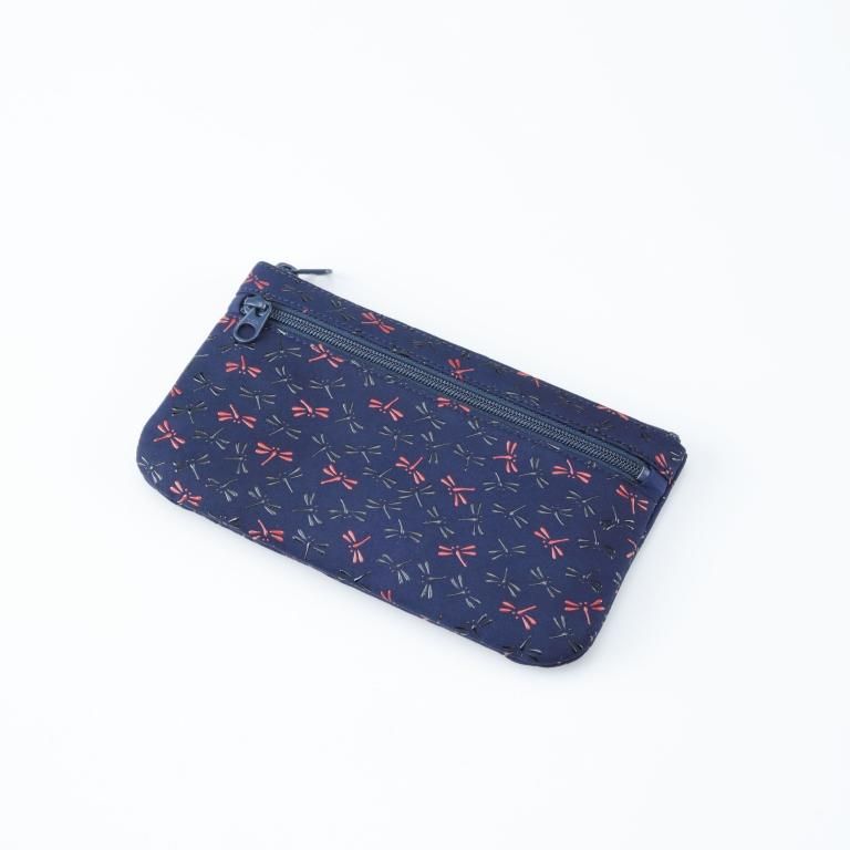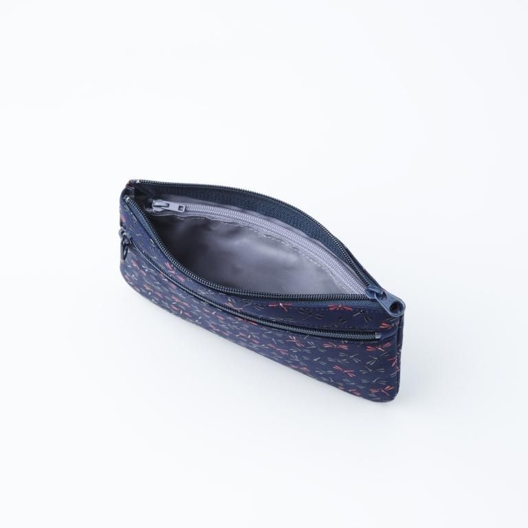 落ち着いた紺革の風合いに、赤漆で描いた赤とんぼがアクセント。