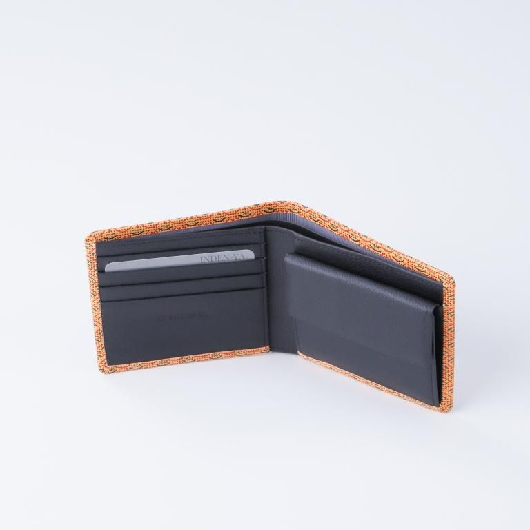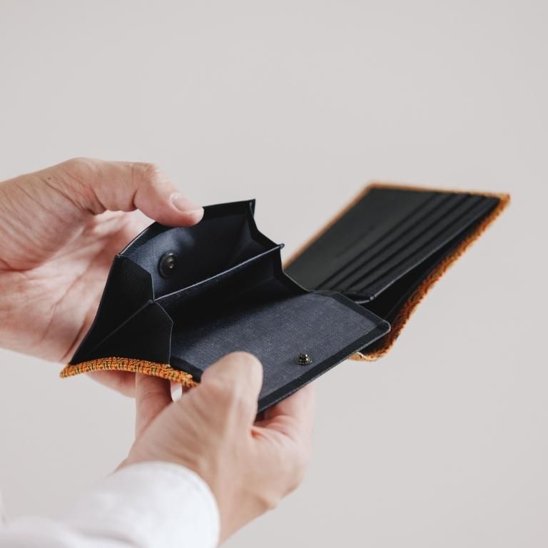 ジャケットやスーツなどのポケットに収められる二つ折りタイプのお財布。