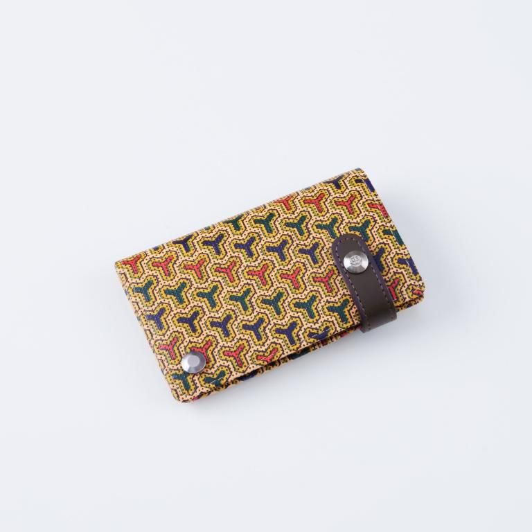 やわらかな山吹色に染めた鹿革に、多彩な色を重ね、さらに艶やかな漆模様で覆う印伝の「更紗(さらさ)」技法で描かれています。