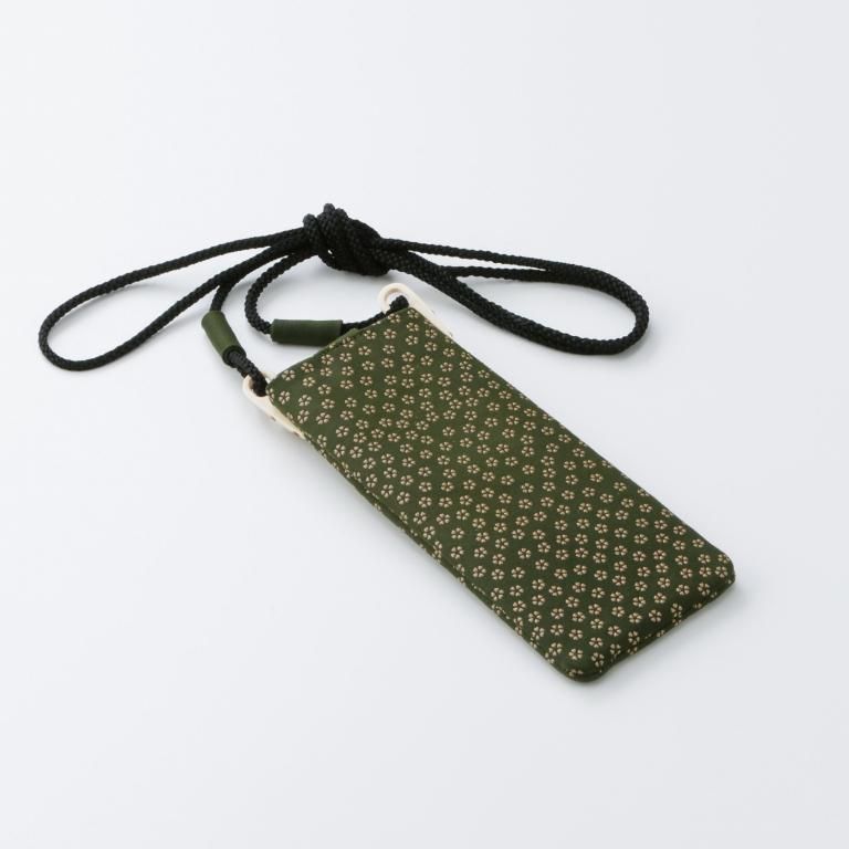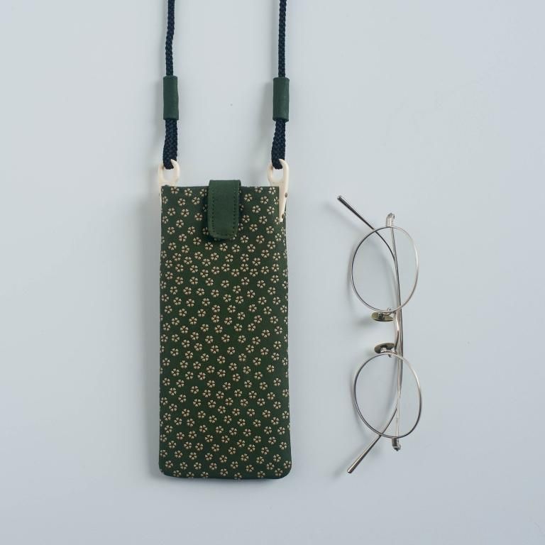 作業の合間やふとした瞬間にはずしたメガネは、スマートに首からさげた印伝のポシェットへ。