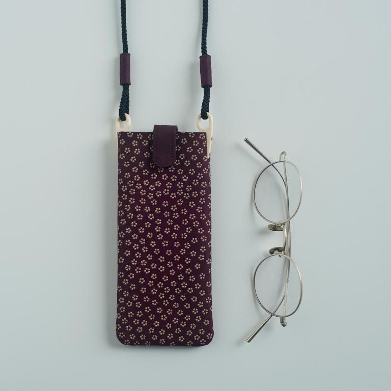 作業の合間やふとした瞬間にはずしたメガネは、スマートに首からさげた印伝のポシェットへ。