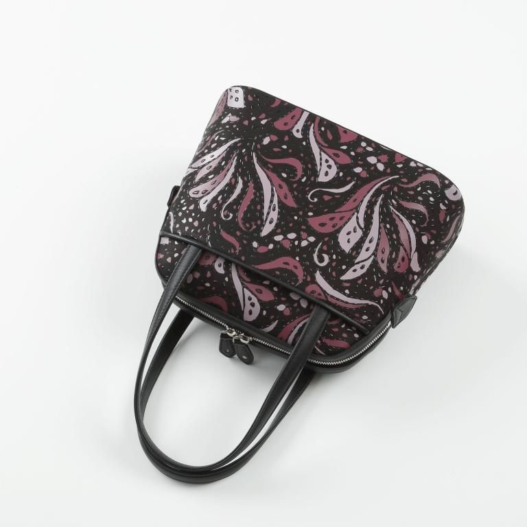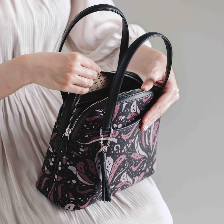 葡萄酒色と浅紫色の更紗でフリージアの花弁を、艶やかな黒漆で花々の瑞々しい躍動を表現しました。