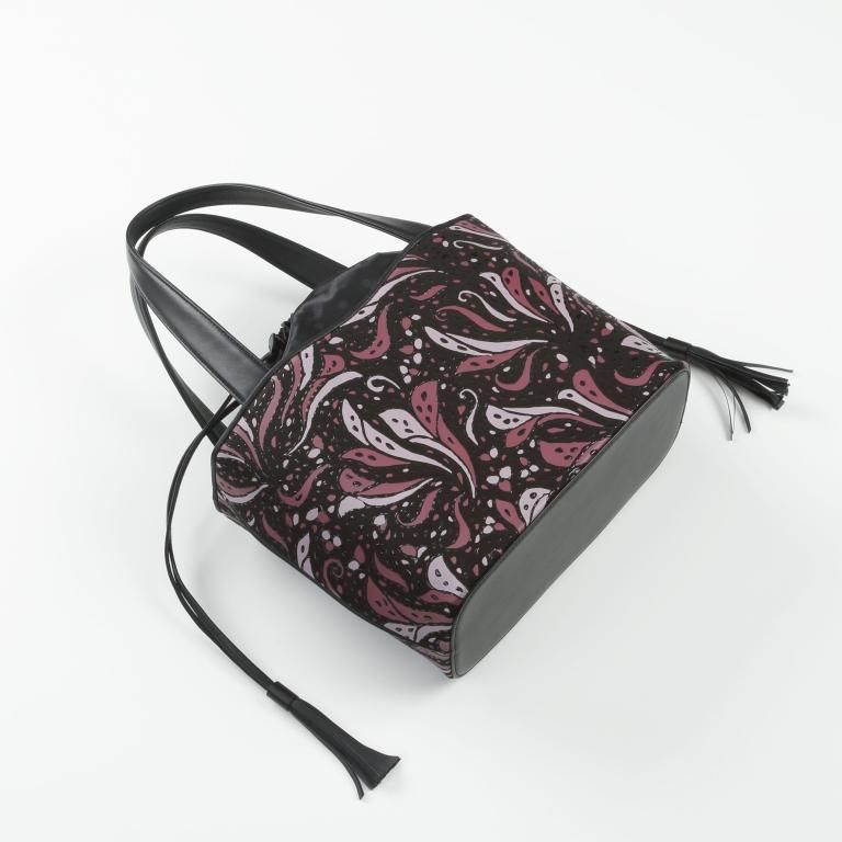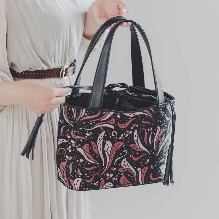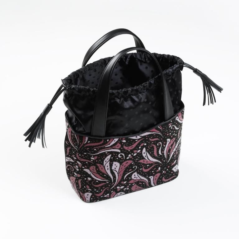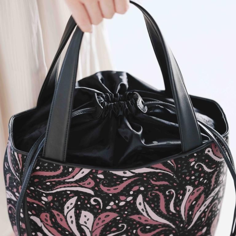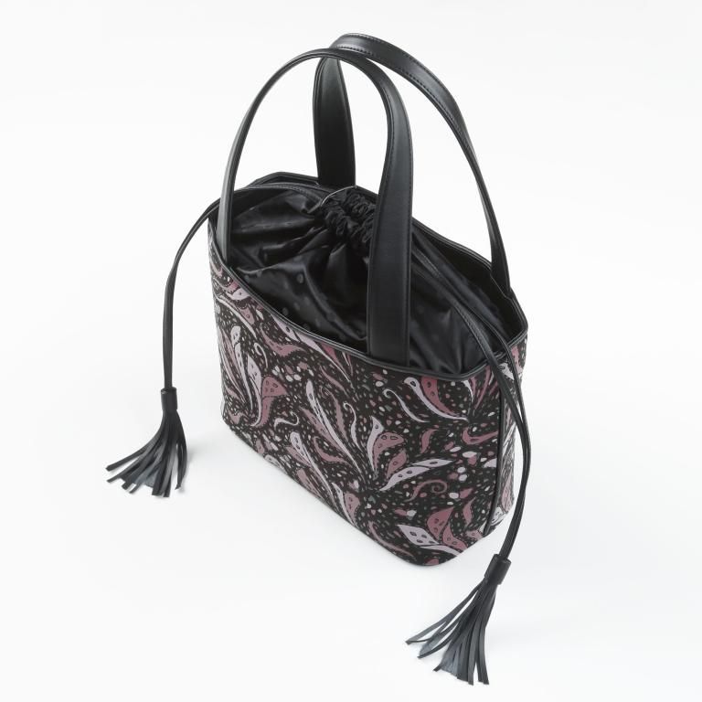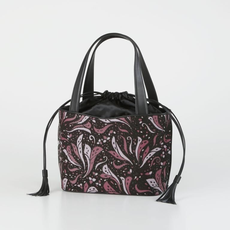 洋装はもちろん、カジュアルな和装にもフリージア模様が可憐に映えるように、洋風ハンドバッグと、巾着バッグを組み合わせた個性的なデザインが誕生しました。