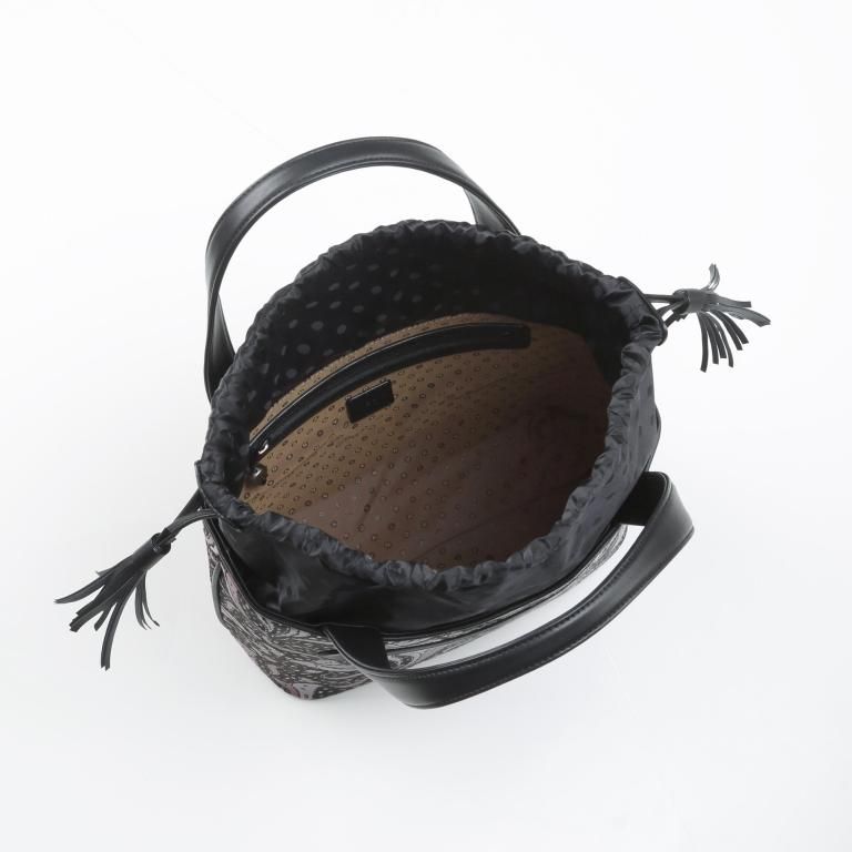牛革の手紐を緩めるとバッグの口が開くシンプルな構造で、中身の出し入れや確認が容易です。