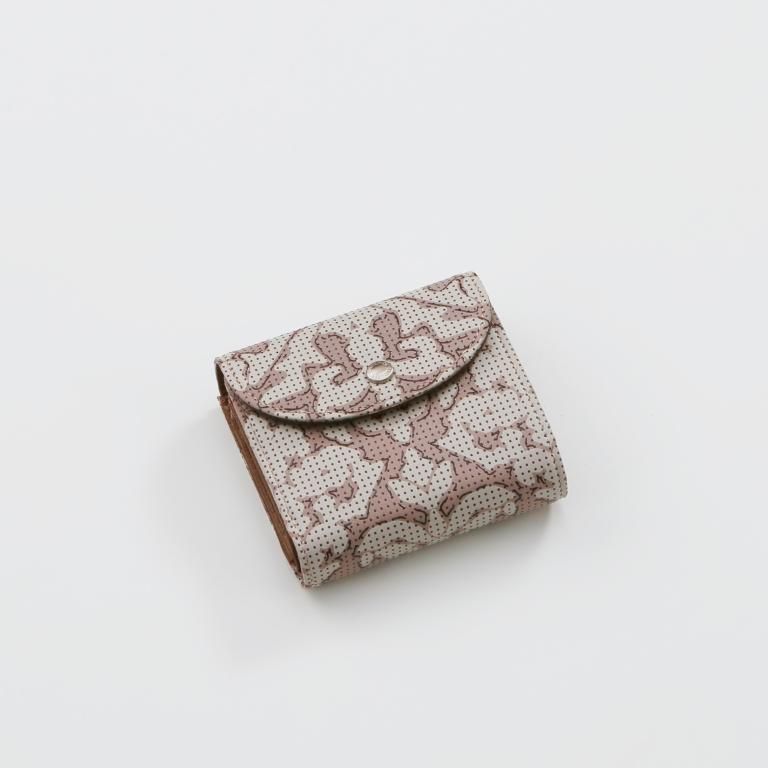大人の女性を引き立てるグレージュの鹿革をベースに、アイボリーの更紗と茶色の漆で植物の幾何学模様を描きました。