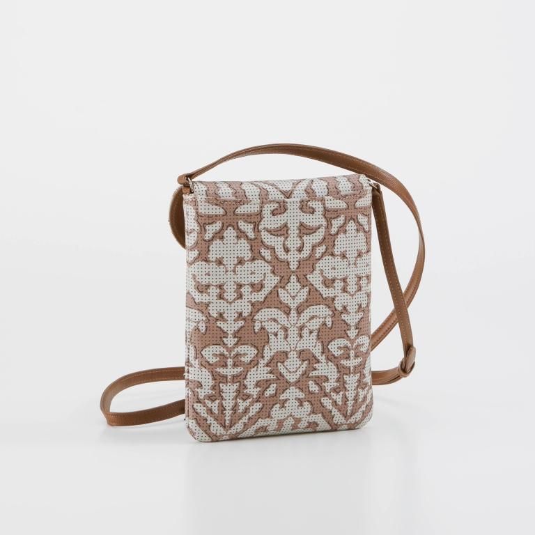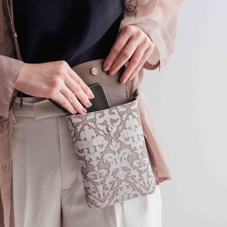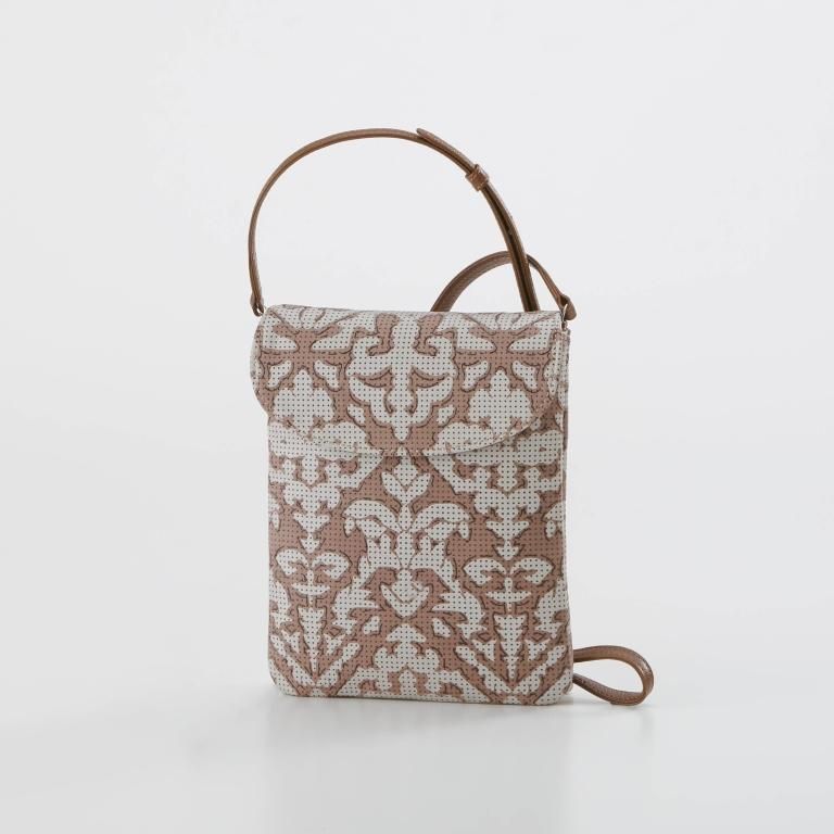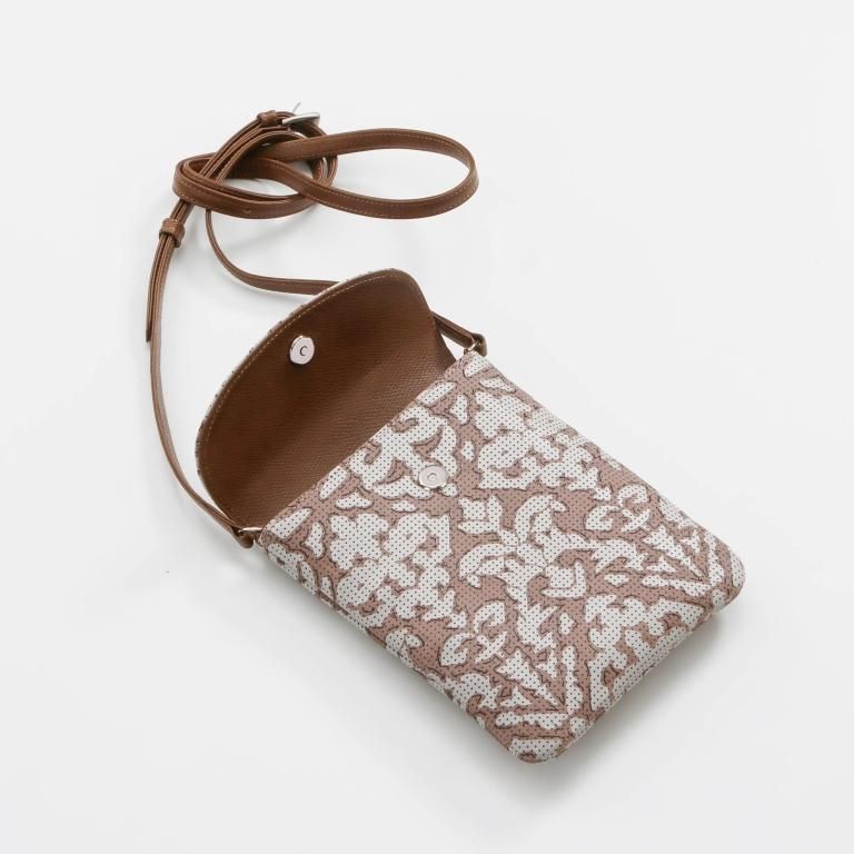 大人の女性を引き立てるグレージュの鹿革をベースに、アイボリーの更紗と茶色の漆で植物の幾何学模様を描きました。
