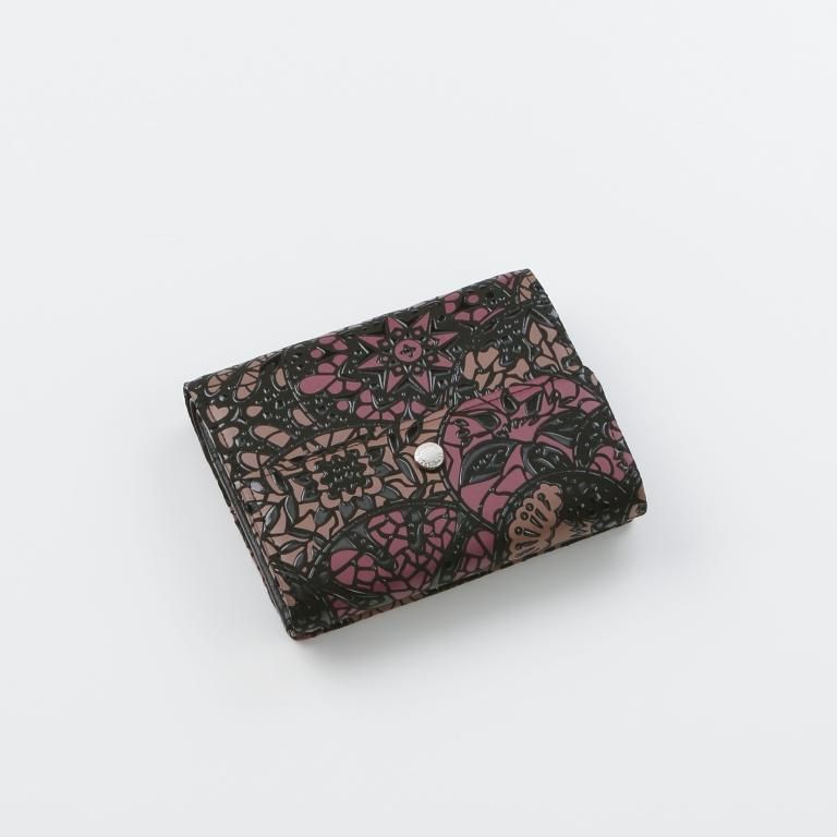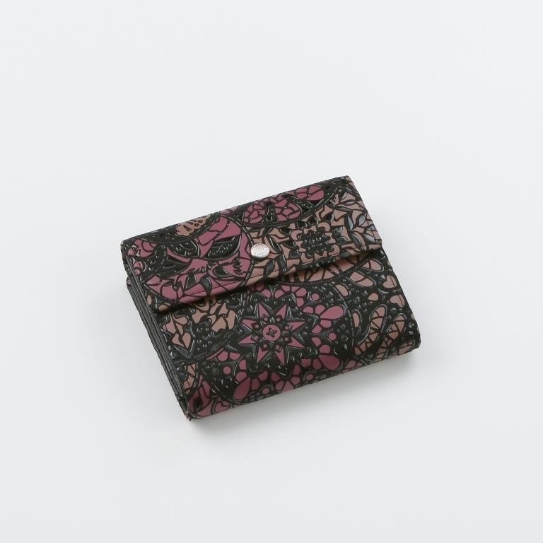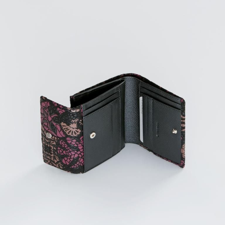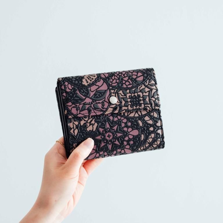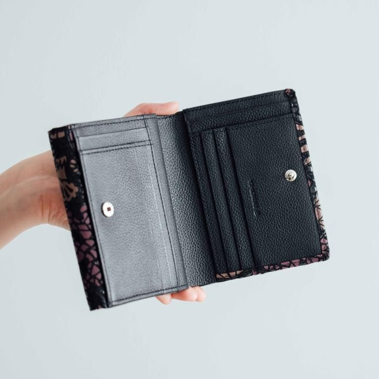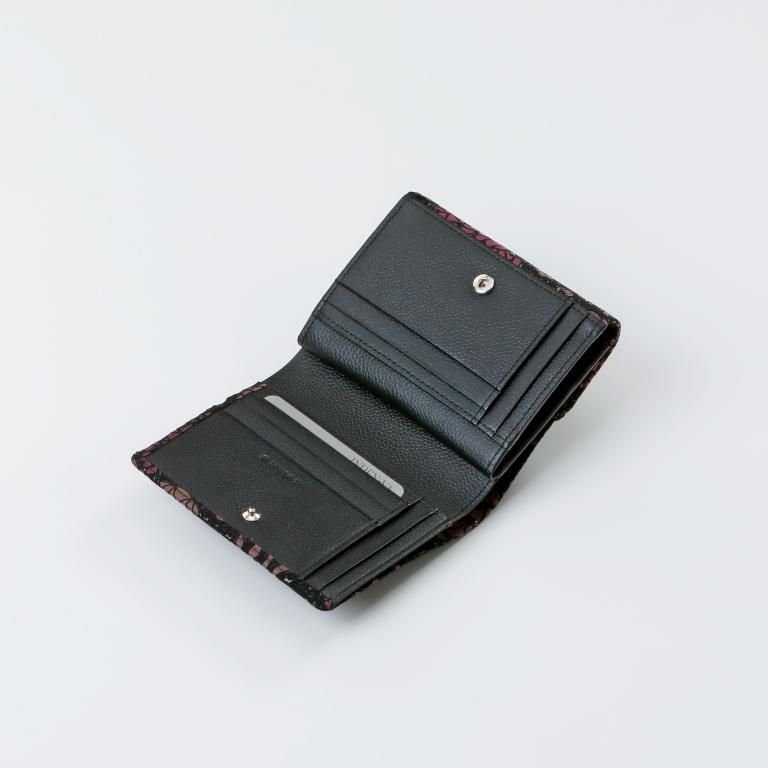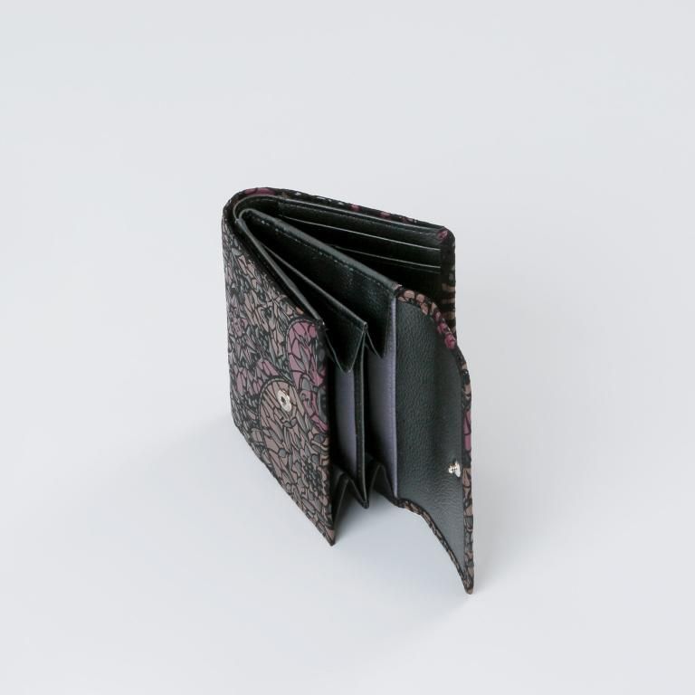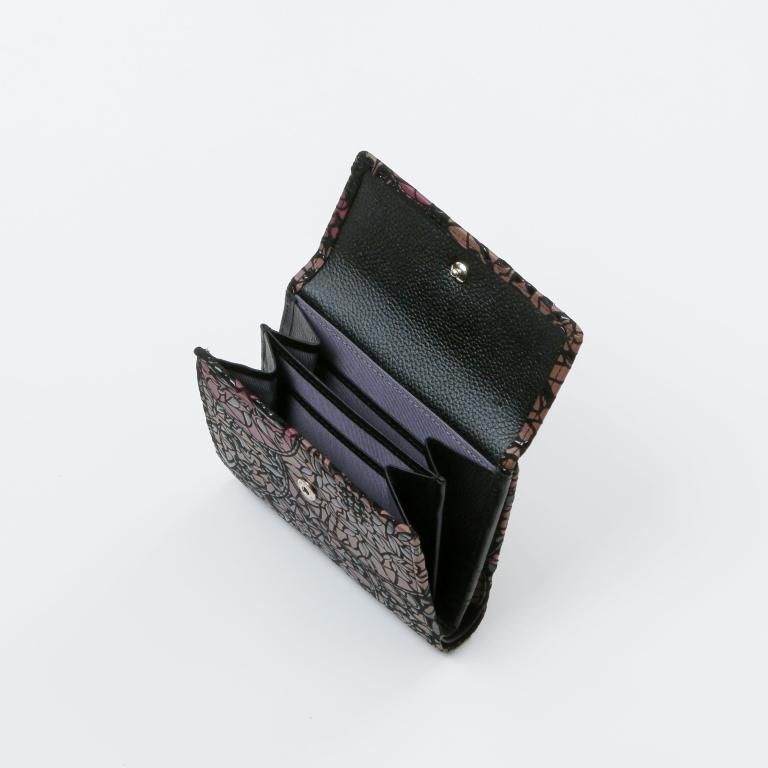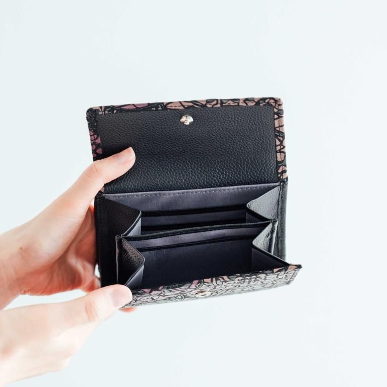 - 口前はホック留め/ホック留めのかぶせ式小銭入×1/小銭入は中仕切り付き/小銭入内にポケット×6