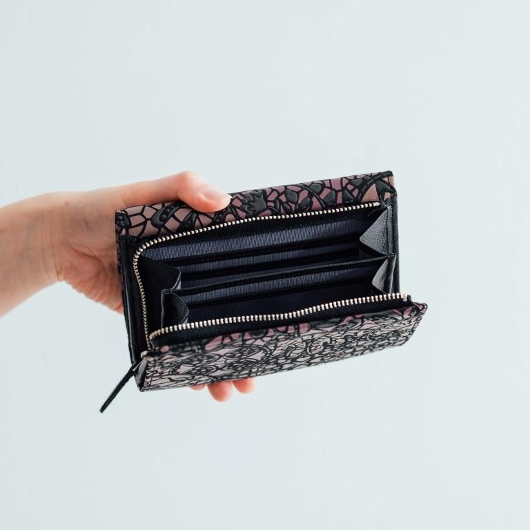 お財布外側のL字ファスナー式小銭入も大容量。また、中仕切りで整理してご利用いただけます。