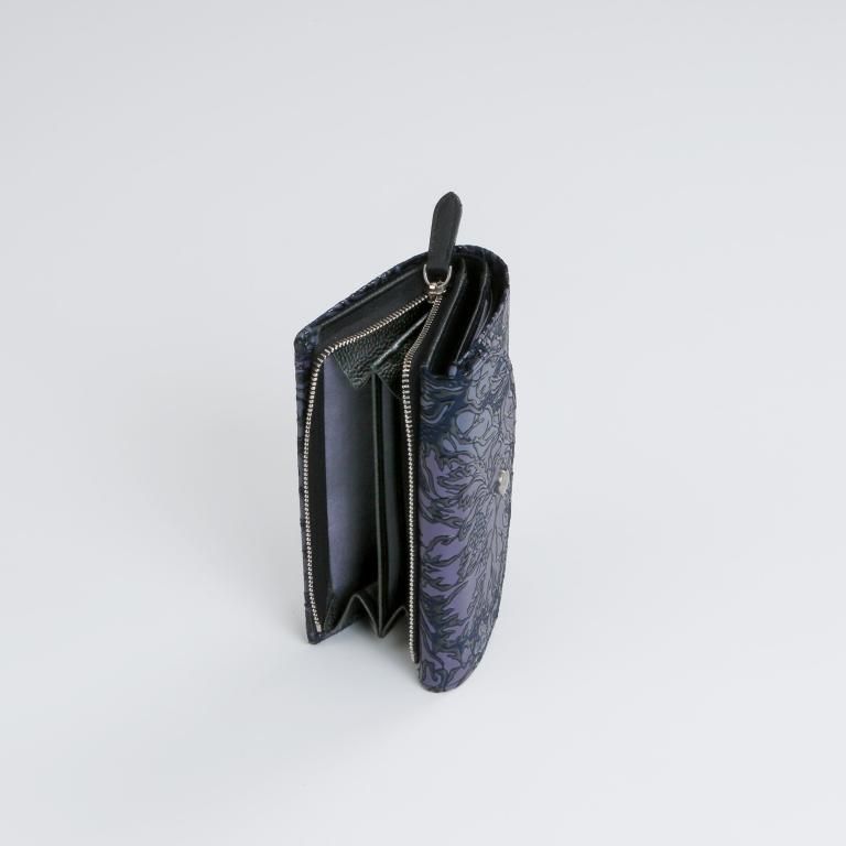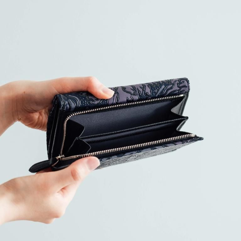 - 口前はホック留め/ホックは2段式/中仕切り付きL字ファスナー式小銭入×1