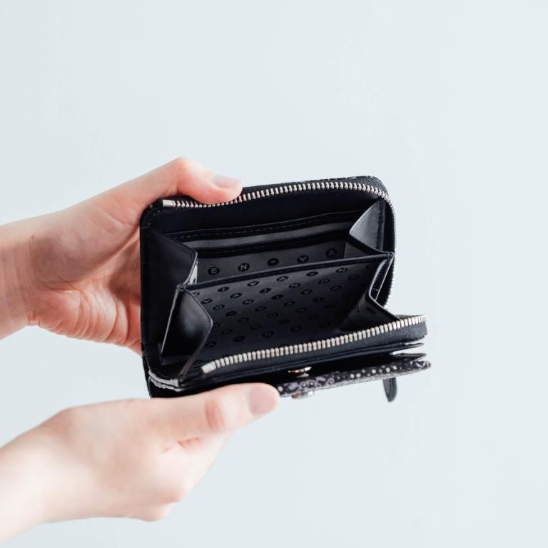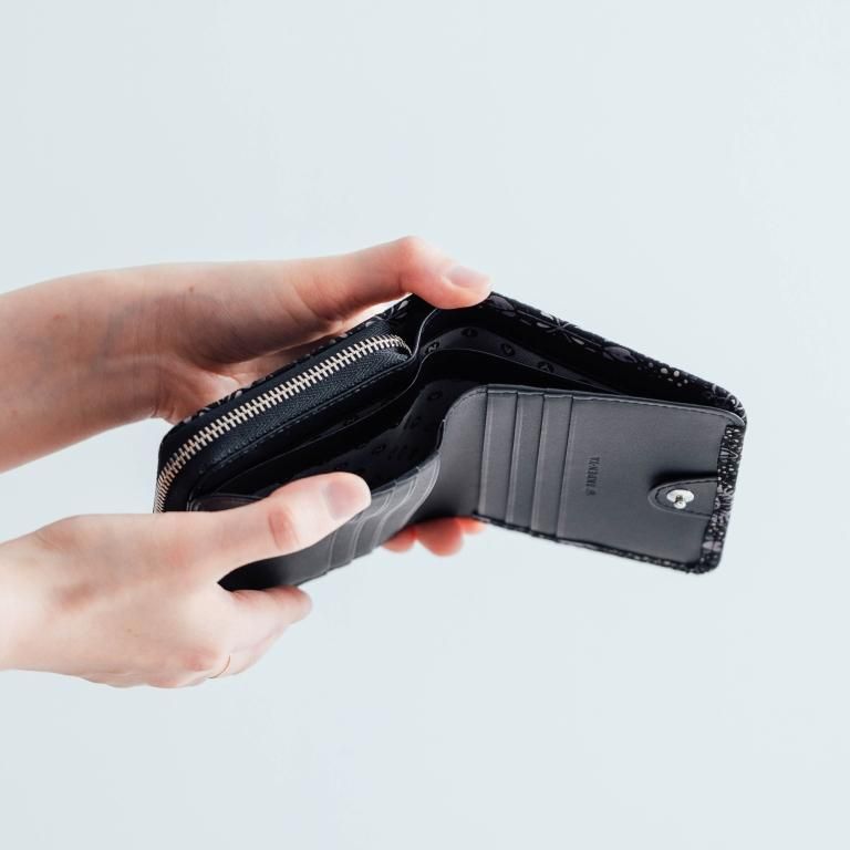 二つ折りのお財布を、実用性をそのままに手のひらサイズまでコンパクト化しました。