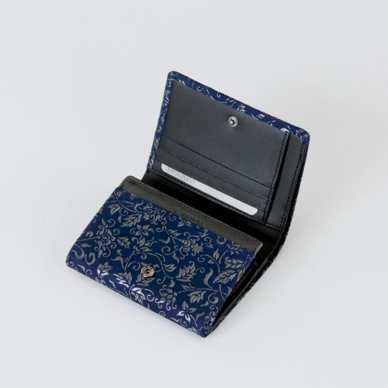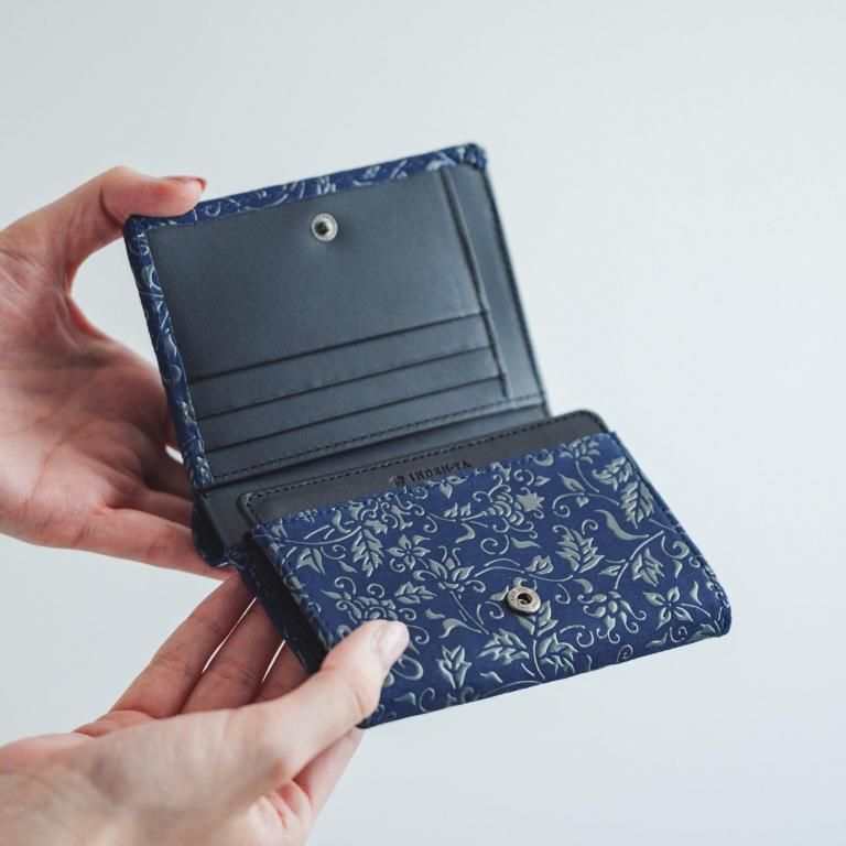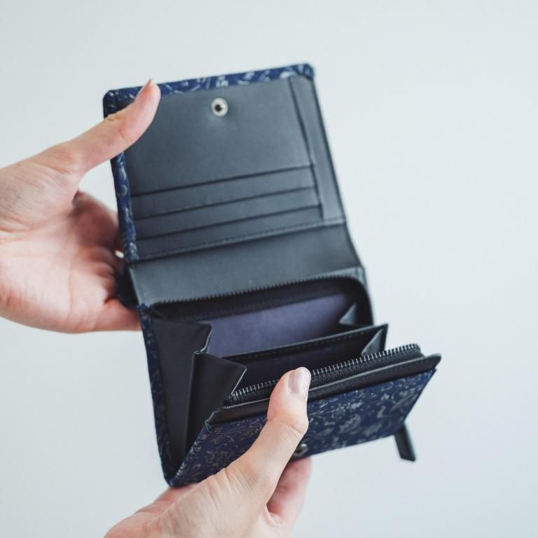 二つ折でコンパクトながらも、少し大きめ容量のL字ファスナー小銭入が特徴。