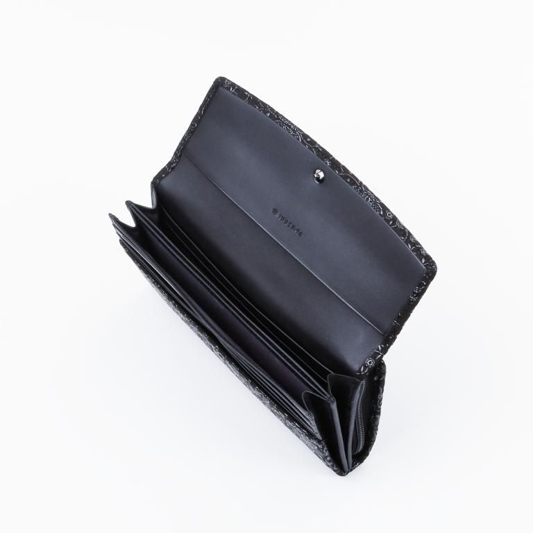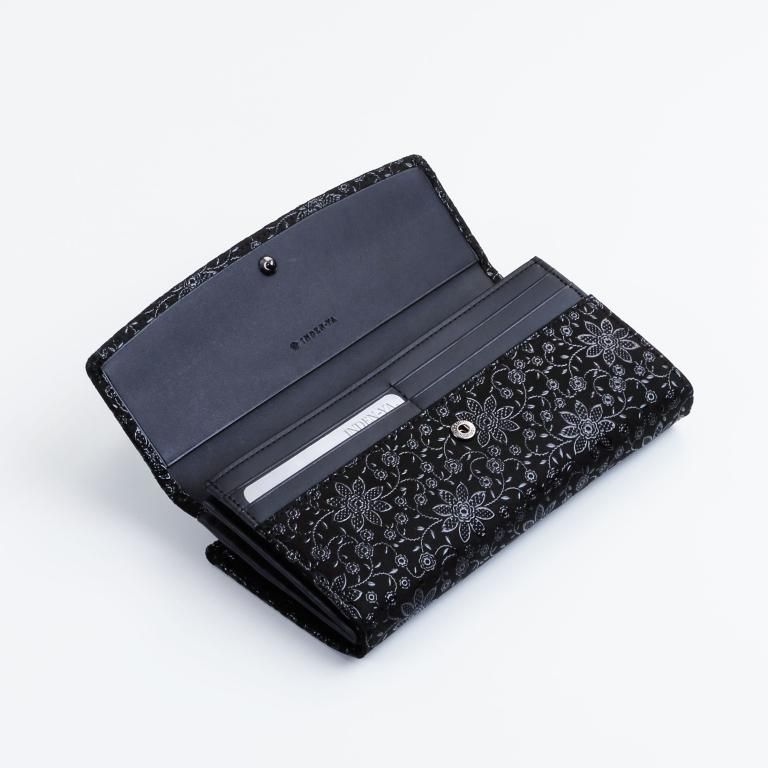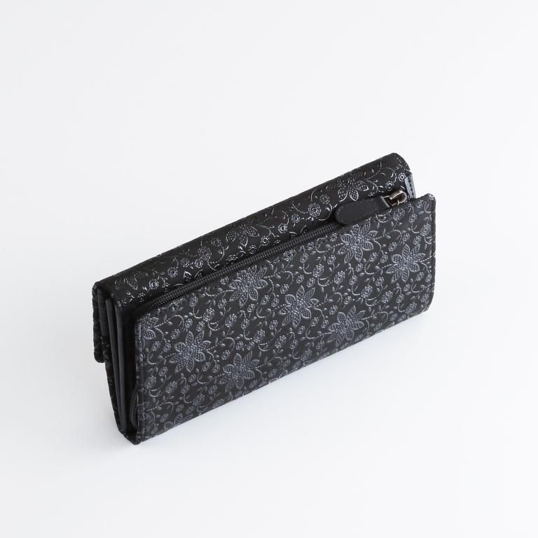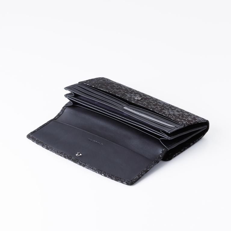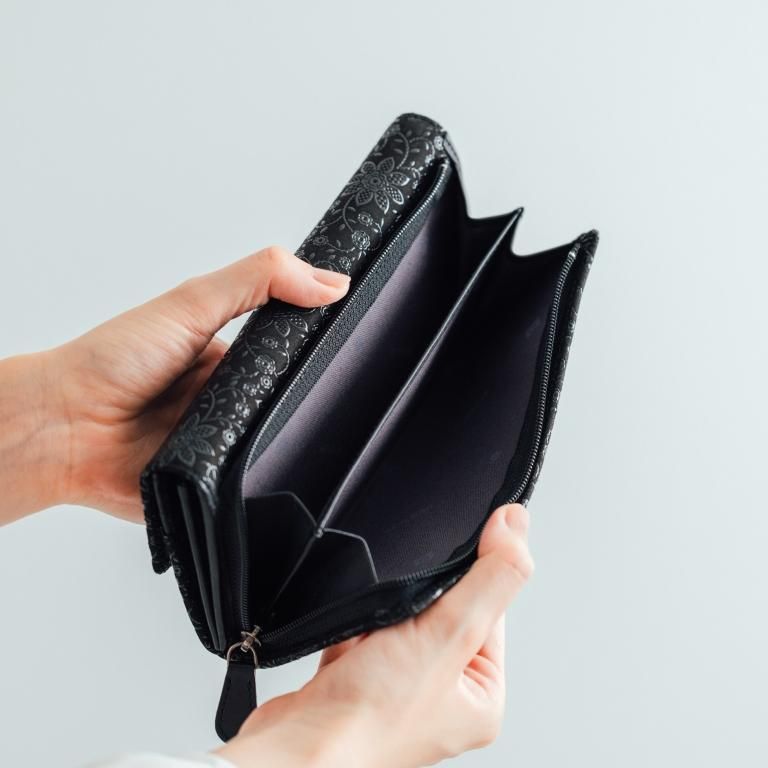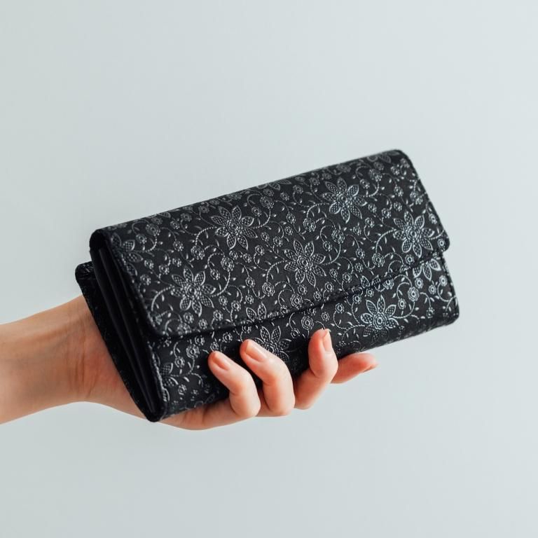 印伝革ならではの手触りと、艶やかな漆模様を贅沢に愉しめるようにデザインした、オーセンティックな長財布。