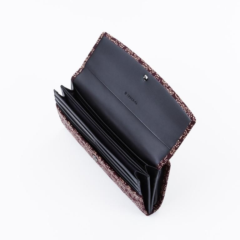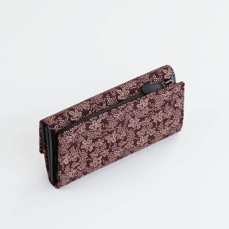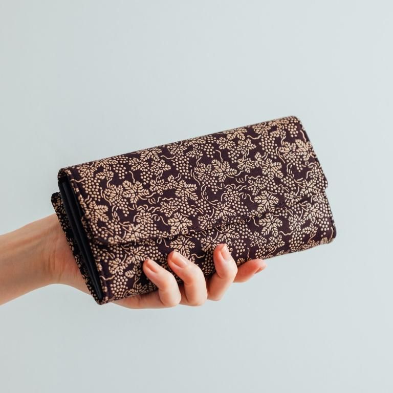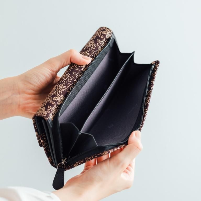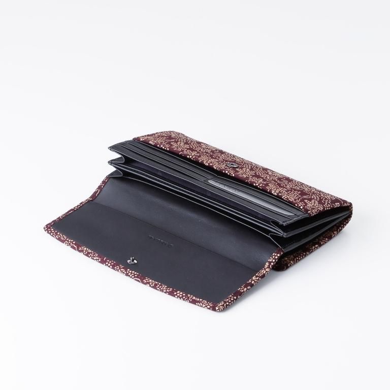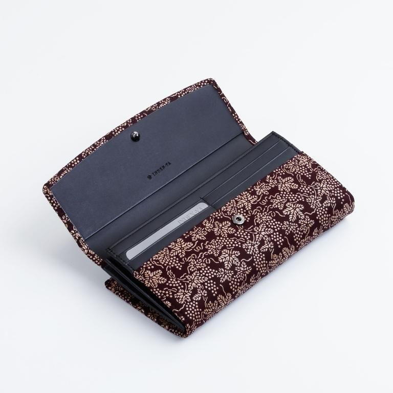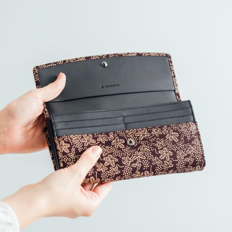 印伝革ならではの手触りと、艶やかな漆模様を贅沢に愉しめるようにデザインした、オーセンティックな長財布。