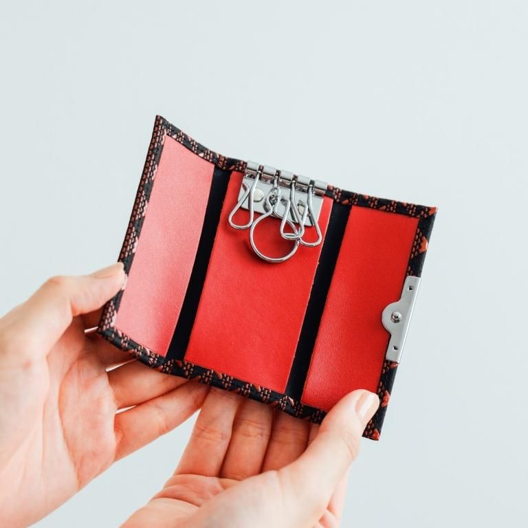 4つのキーホルダーを手触りの良い印伝で包んだキーケースです。さりげなく粋に携えられるスリムな仕様。
