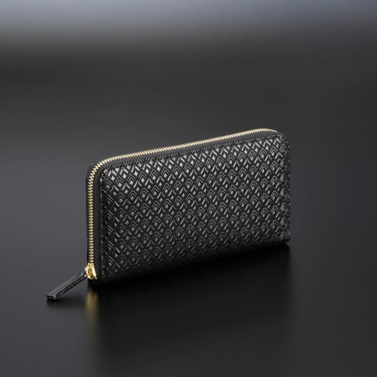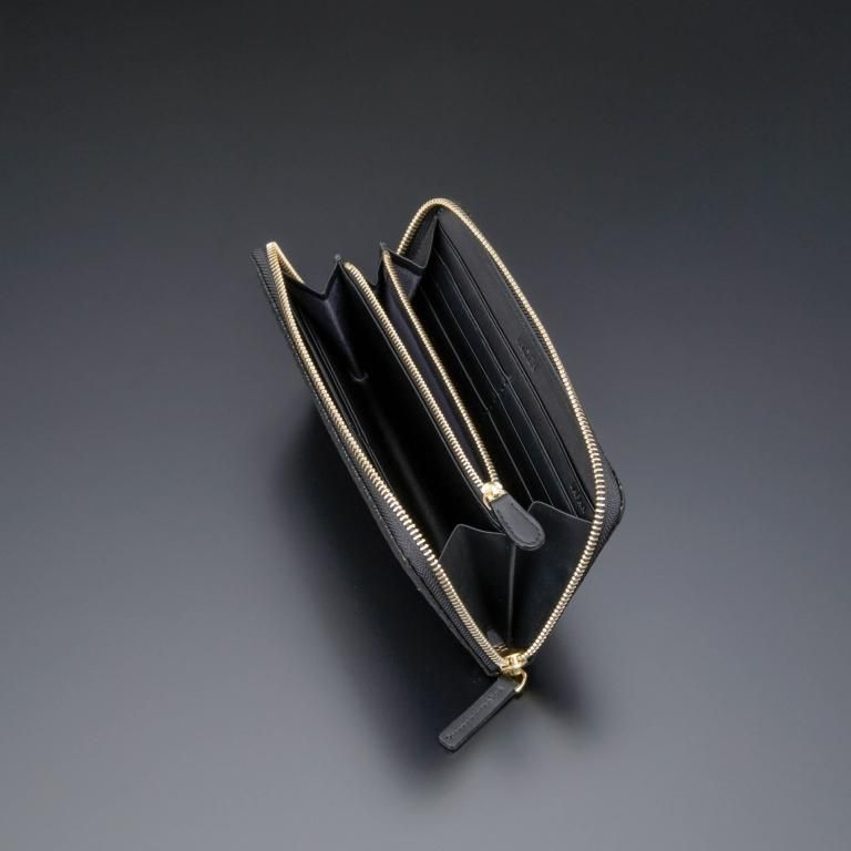 漆の光沢とゴールドの金具が上品な印象を醸すベーシックなラウンドファスナー長財布。
