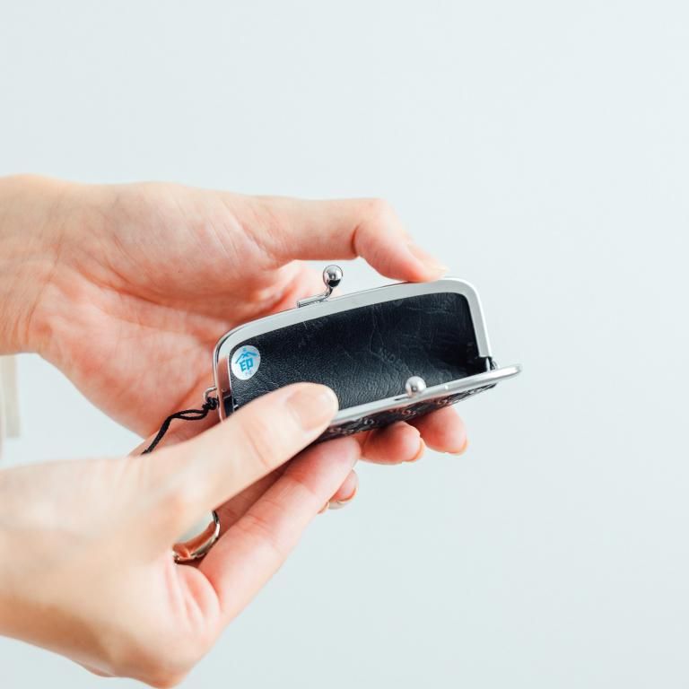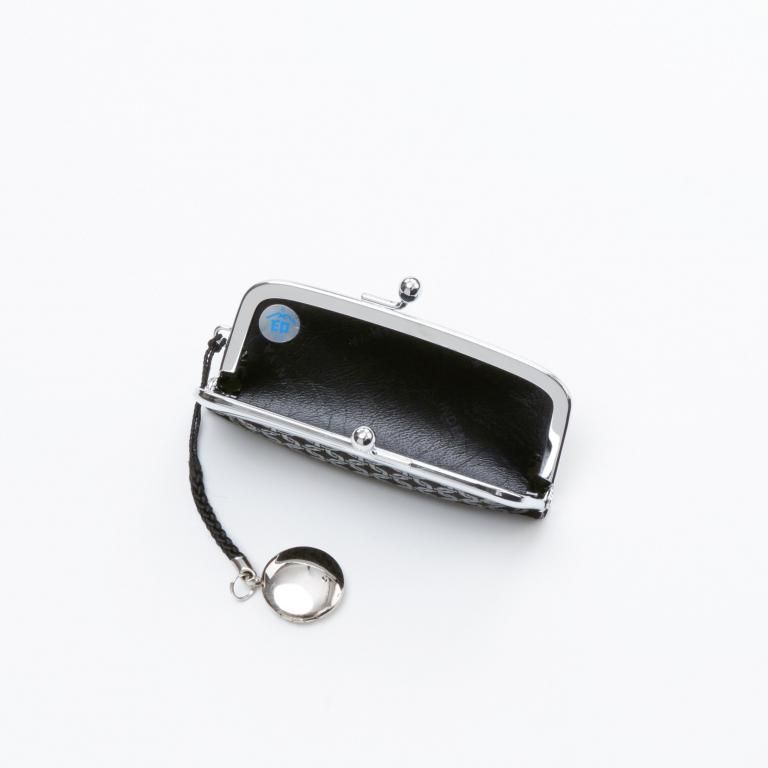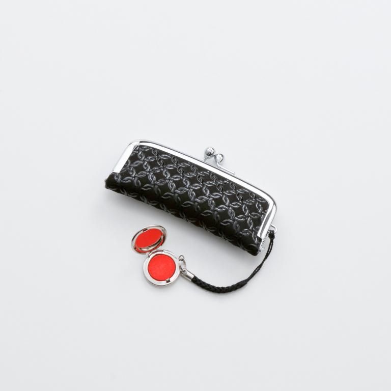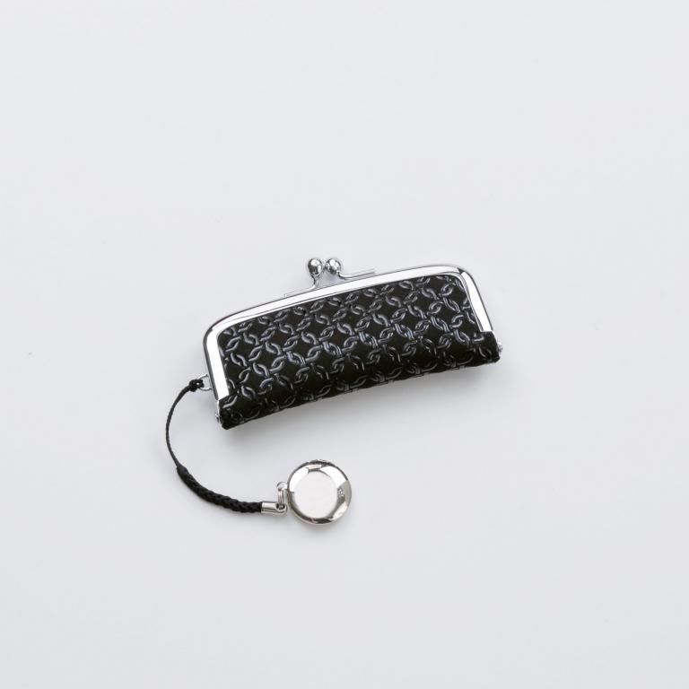 口金タイプの印鑑ケースです。付属する朱肉は紐で結ばれています。