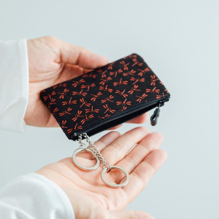 メイン収納は、車の電子キーも収まるサイズでファスナーを開いた内側に2つのキーリングを備えています。