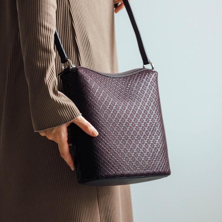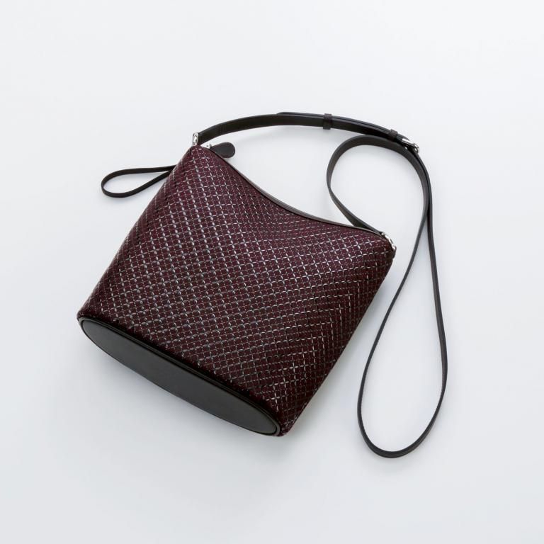 シックで艶やかな印伝革を大きく使い、豊かに丸みのある立体的なデザインを縫製で実現しました。