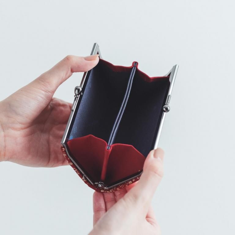 口金をひらくと、中身が確認しやすく機能的。小銭や小物は整理して大きな収納へ、お札やカード類はスマートに中仕切りへ収納できます。