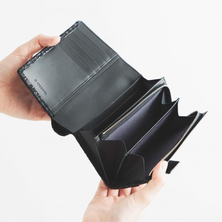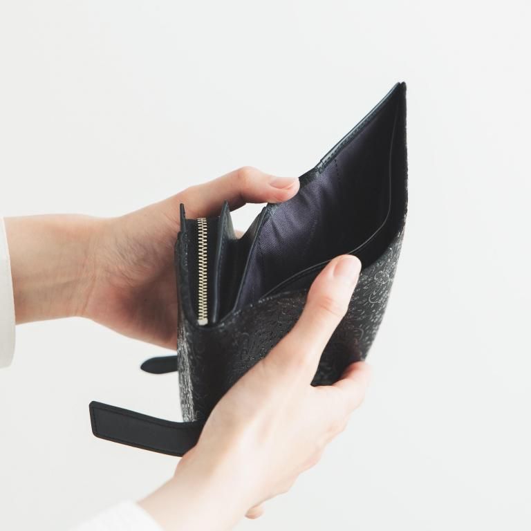内側のL字ファスナー式小銭入は大きく開くため中身が確認しやすく機能的です。
