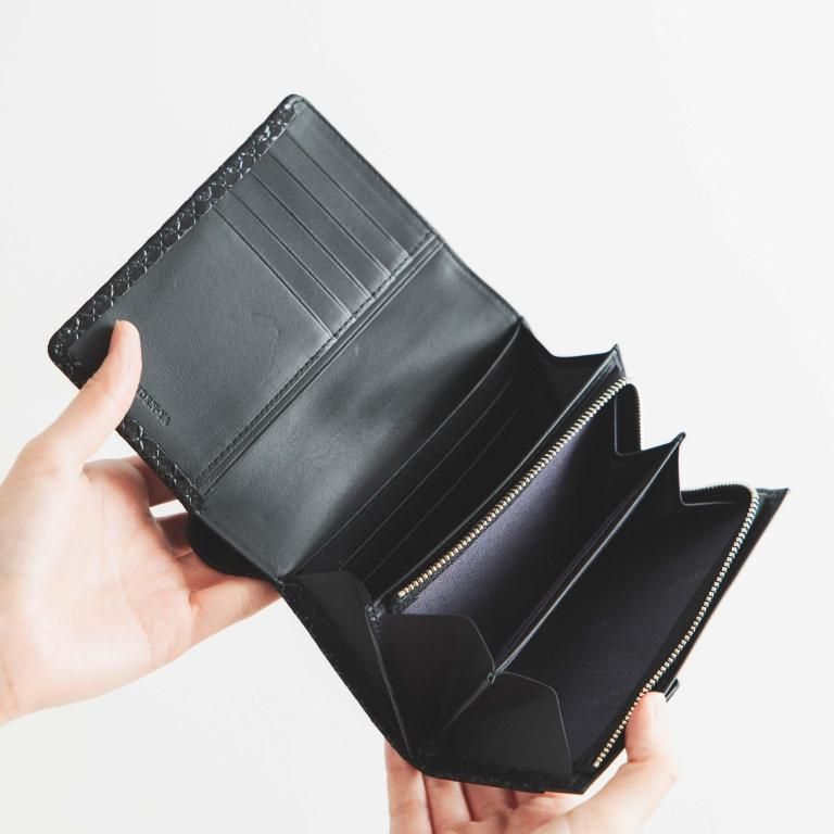 長財布の2/3ほどの大きさに、札入2つ、カードポケット13、マルチポケット5つをコンパクトに集約。