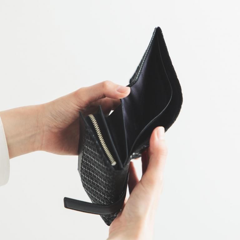内側のL字ファスナー式小銭入は大きく開くため中身が確認しやすく機能的です。