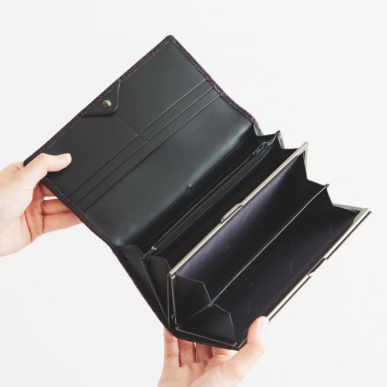 がま口式とファスナー式、2つのポケットがチャームポイントの長財布。お財布に収納したいものは、お金やカード類に限りません。