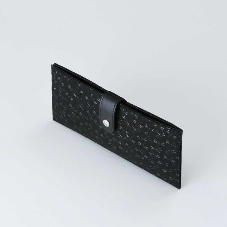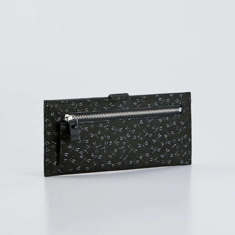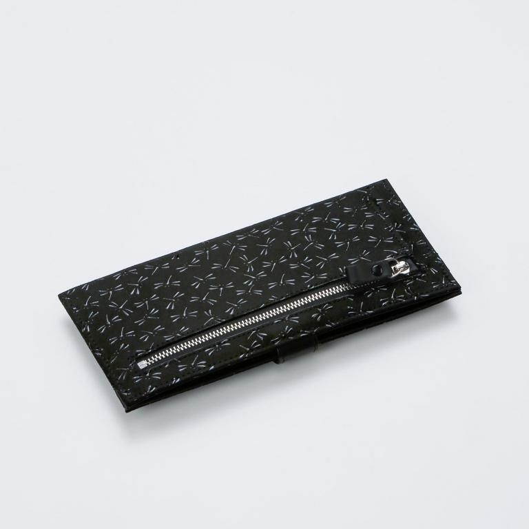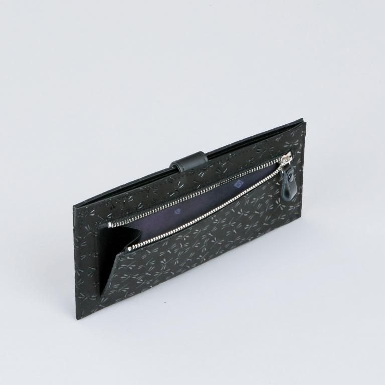 - 口前はホック留めのストラップ式/片マチ付きファスナー式小銭入×1