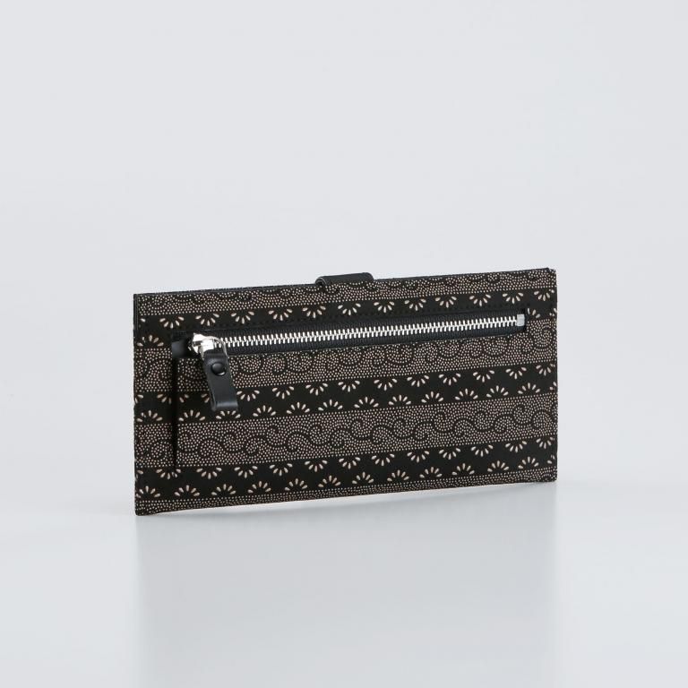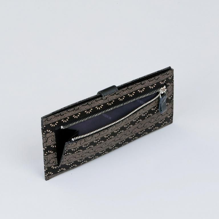 - 口前はホック留めのストラップ式/片マチ付きファスナー式小銭入×1