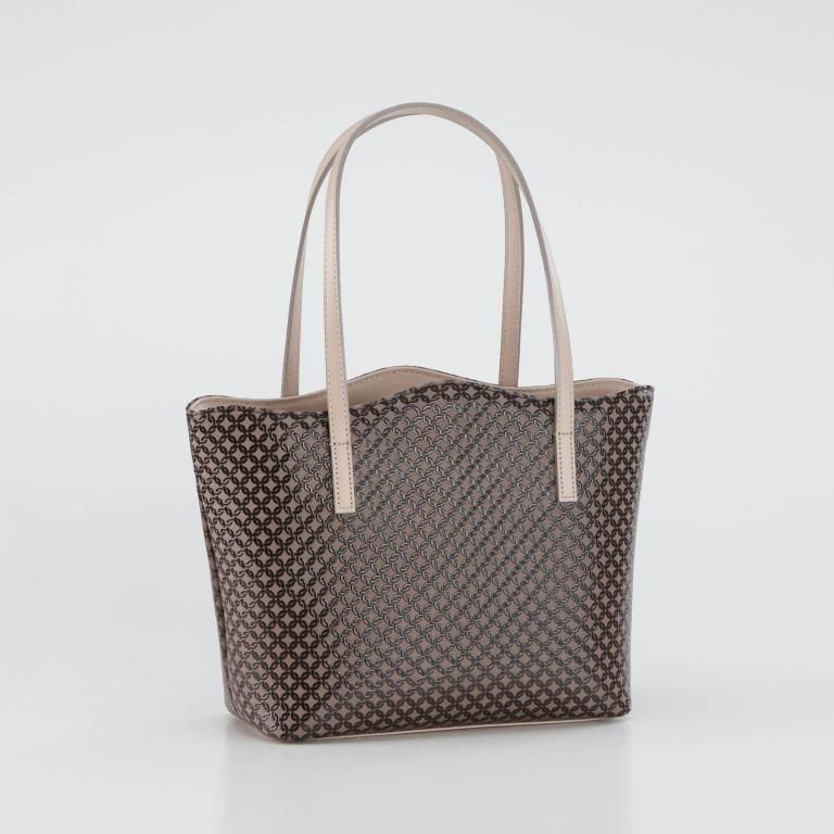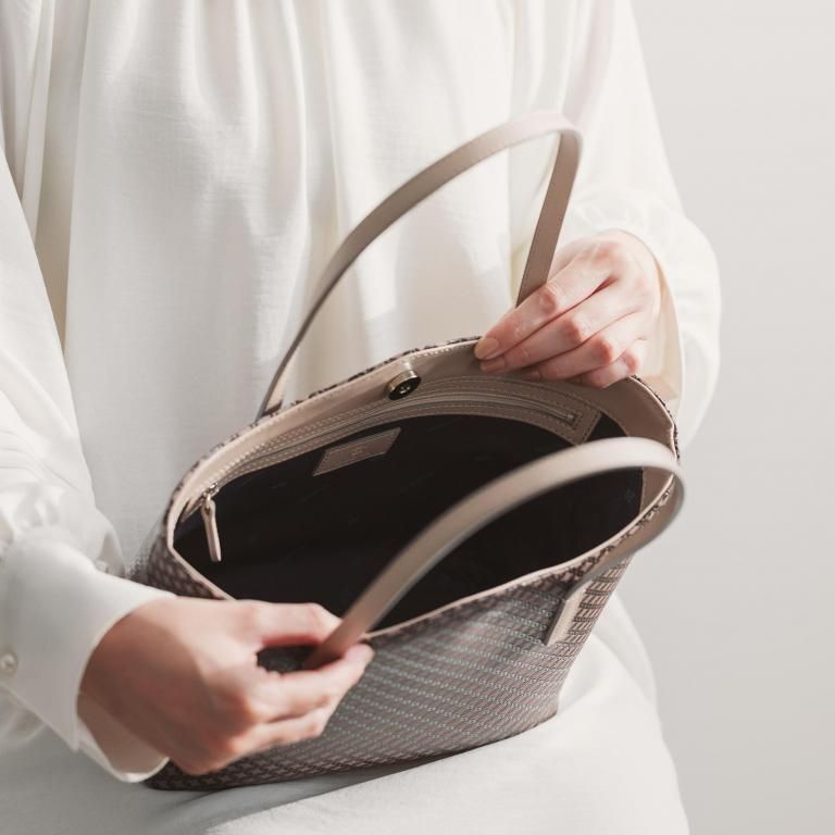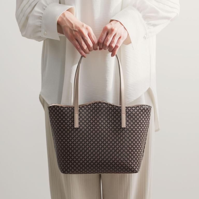 優雅なウェーブを描くシルエットと細身のハンドルが上品さを演出するハンドバッグ。