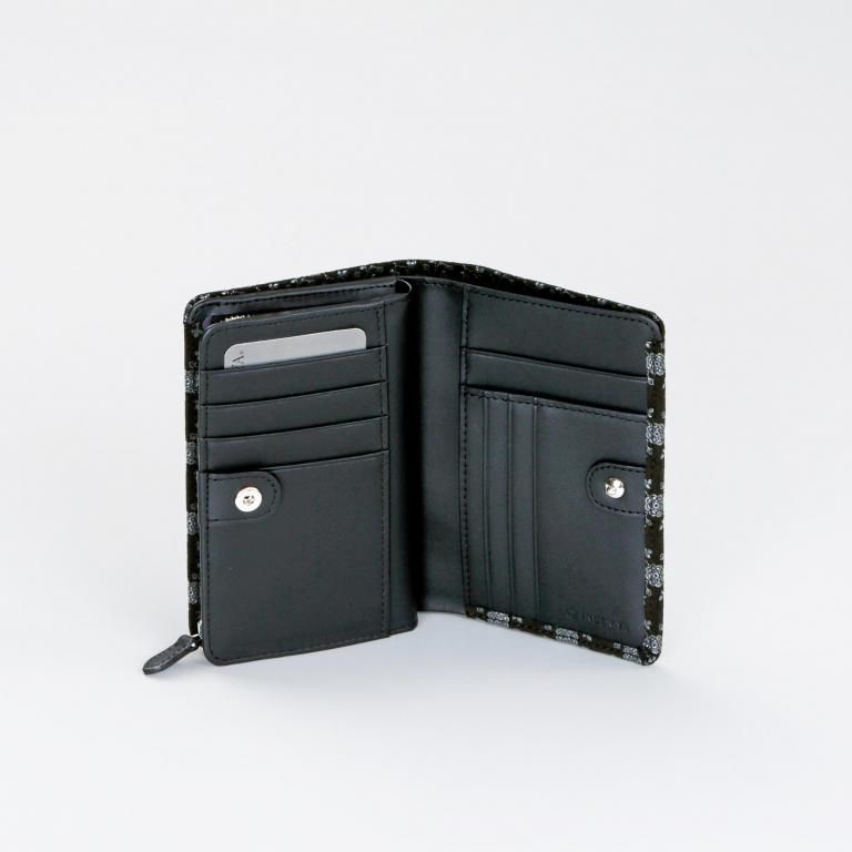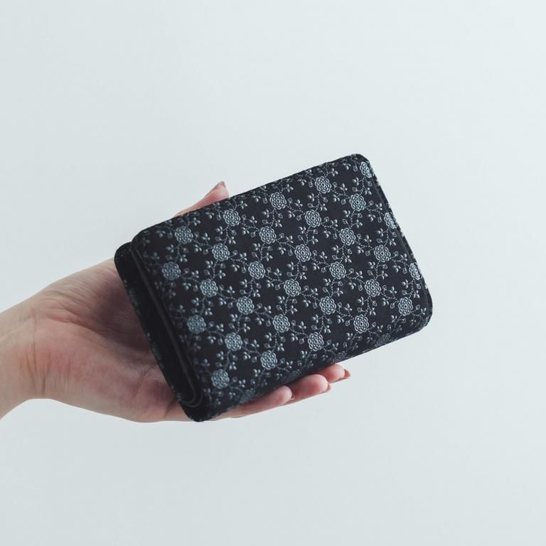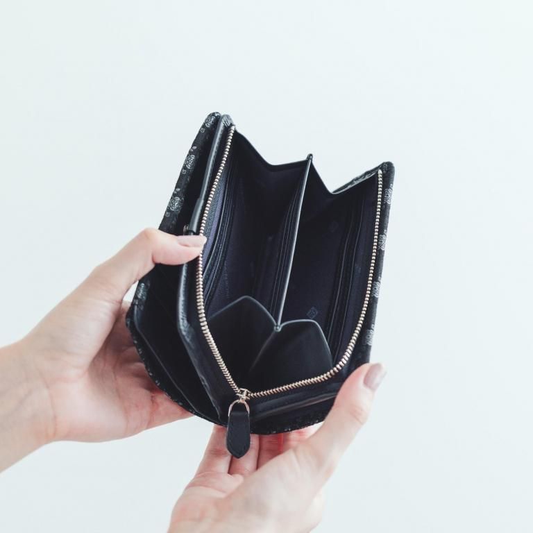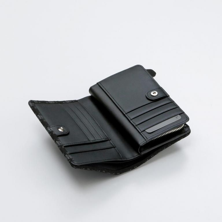 長財布の2/3ほどの大きさに、札入2つ、カードポケット15枚をコンパクトにまとめた収納上手。